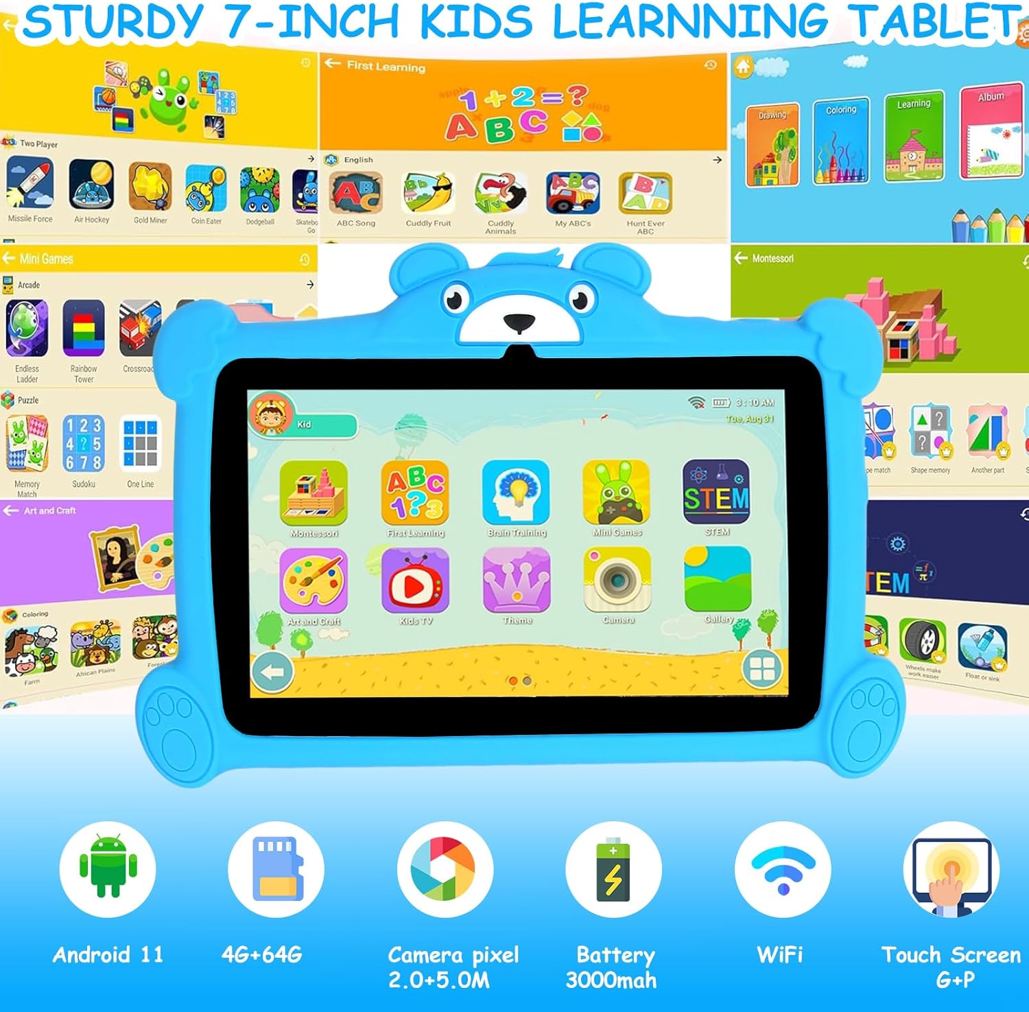 【Powerful Performance for Smooth Usage】 Kids Tablet come with a powerful quad-core processor and dual cameras, it supports 5G Wi-Fi and Bluetooth for fast, reliable connectivity. Running on the Android 11 system with 4GB RAM and 64GB ROM storage (expandable up to 32GB via SD card), it delivers smooth multitasking and quick app loading. A long-lasting 3000mAh battery provides 5–12 hours of continuous use on a single charge, making it perfect for learning.