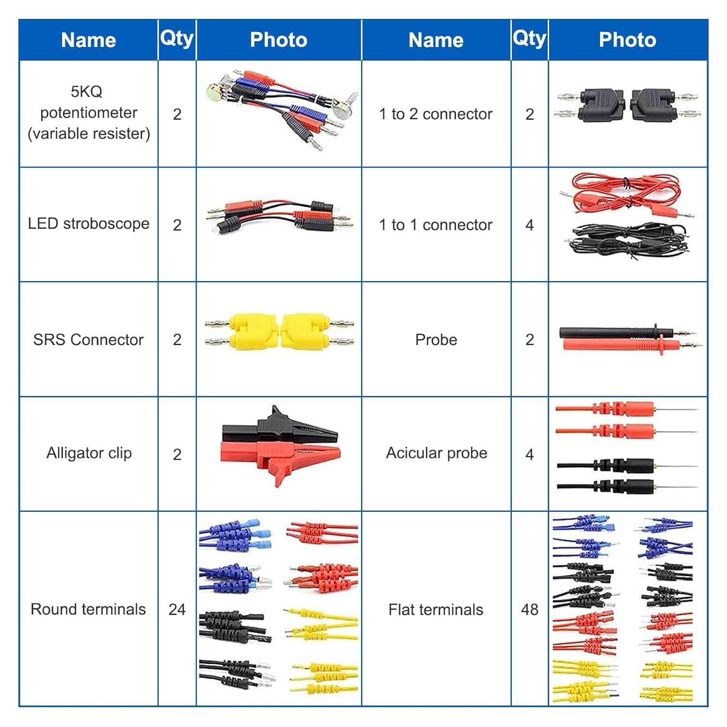 92Pcs PROFESSIONAL TEST LEAD SET: 2 x 5KΩ Potentiometer (Variable Resistor); 2 LED Strobe Lights; 48x Various Automotive Flat Clamps; 4 x Spindle Probes; 24x Different Automotive Round Clamps; 2 Probes; 2 plugs (1 to 2); 2 alligator clips; 4 plugs (1 pair 1); 2 SRS connectors.