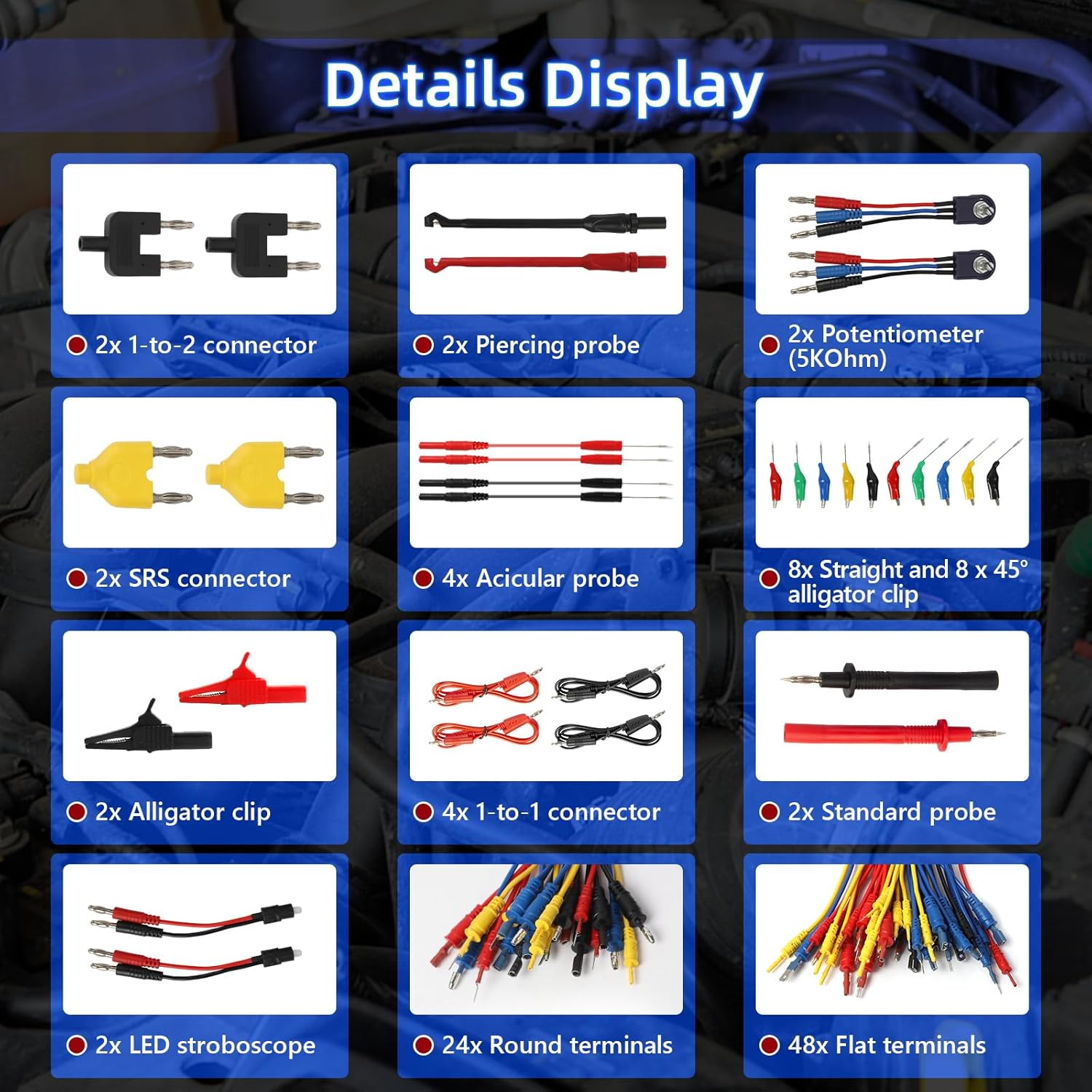 【Widely Application】Leads Diagnostic Wiring Tool Kit has a wide range of applications for most vehicles on the market in Europe and the United States, and it can be used with any multimeter and oscilloscope probe extension cable.It have many equipment, not only for diagnostic testing and repair of vehicle circuits, but also for inspection and maintenance of home appliance systems, electrical repairs, photovoltaic systems, industrial and other fields.