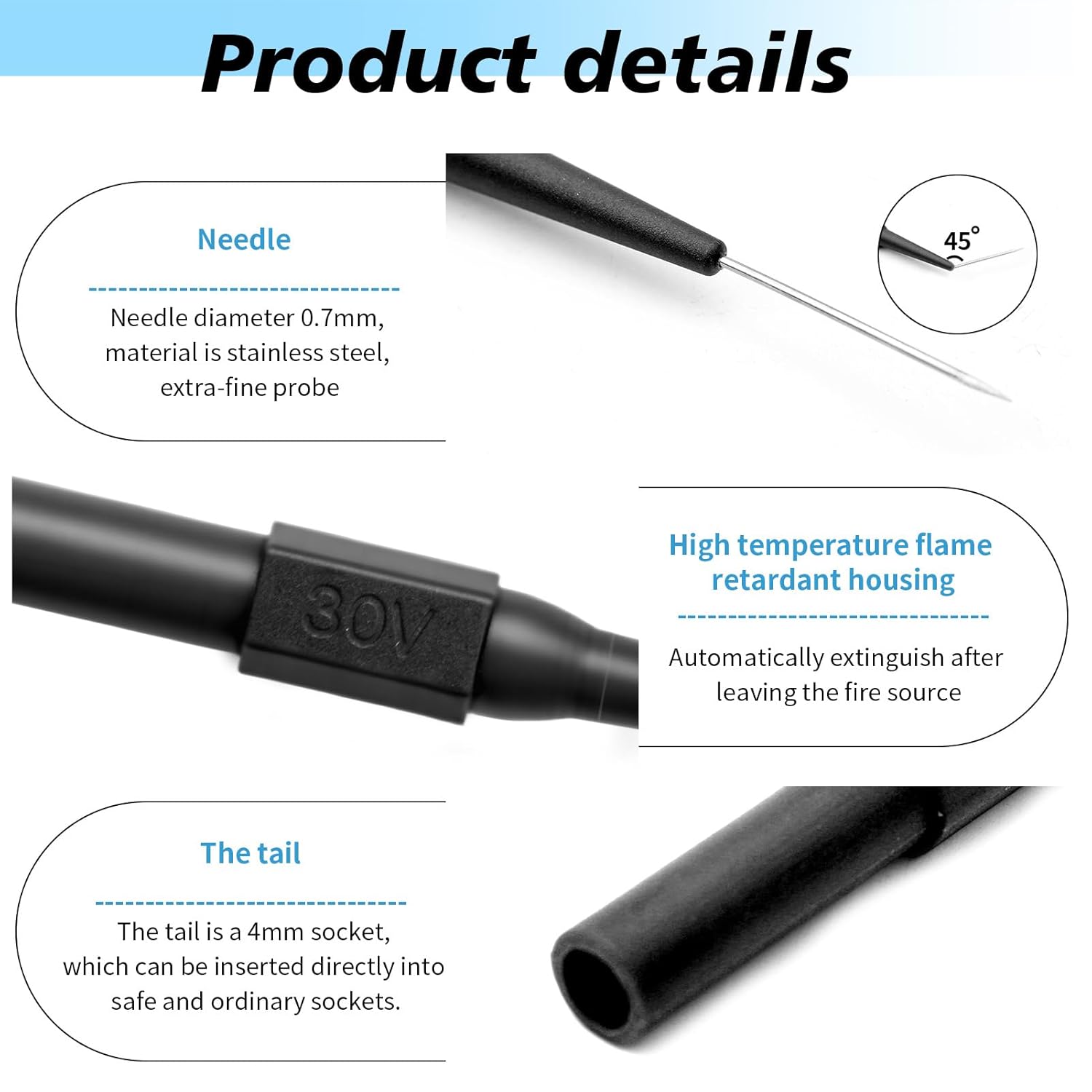 Multi Function: The multimeter probes thin with a standard, each test lead is equipped with a 0.7 mm threading tip, ideal for making precise and efficient measurements. This multimeter probes needle tip includes 15 high-quality multimeter probes in red, blue, black, yellow, green, suitable for a variety of electrical testing applications and a variety of scenarios