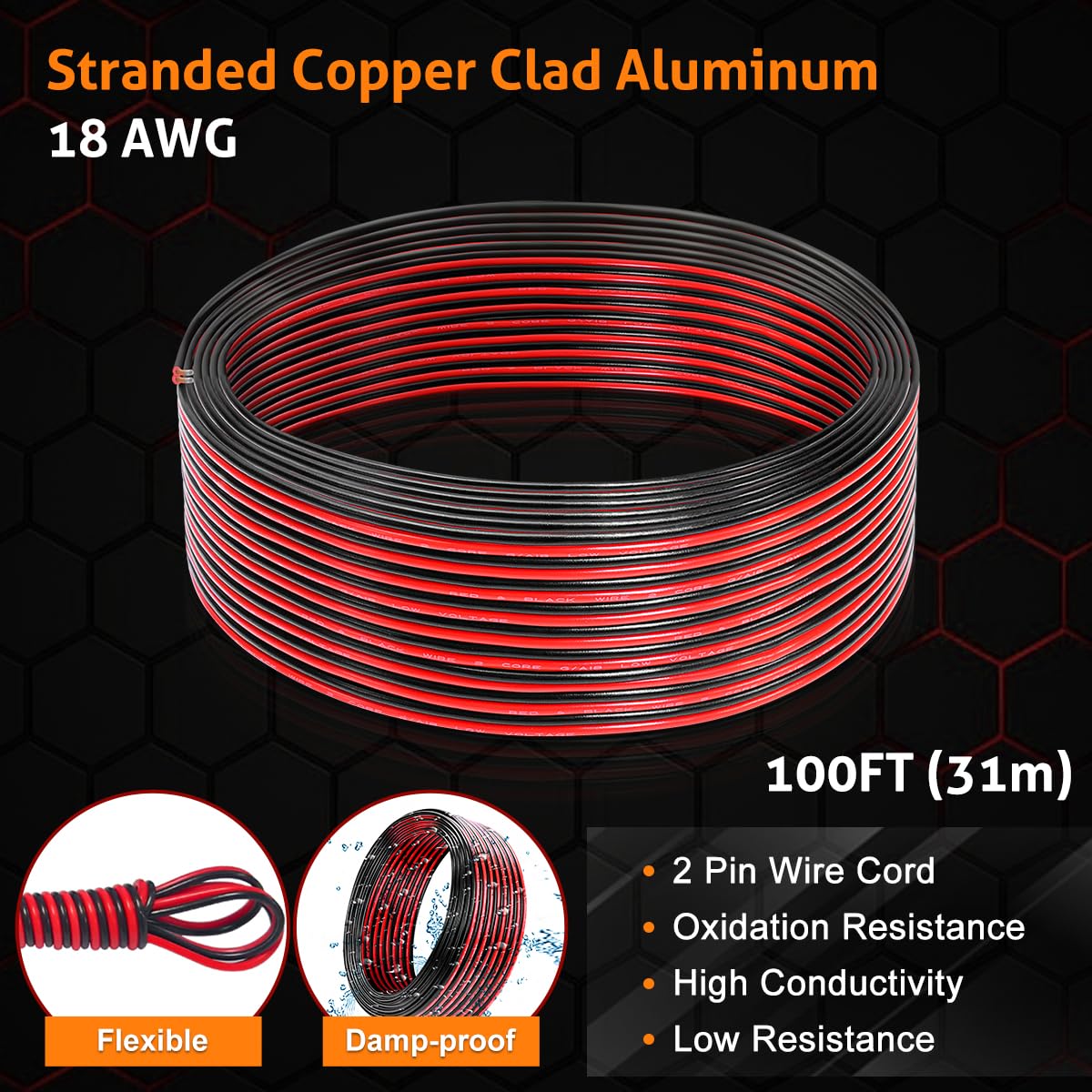 100FT Red + 100FT Black 18 Gauge Power/Ground WireCopper Clad Aluminum(CCA)Rugged & Soft Touch PVC JacketDurable and not easy to breakWide Compatibility for Automotive and more What’s in the Package:
