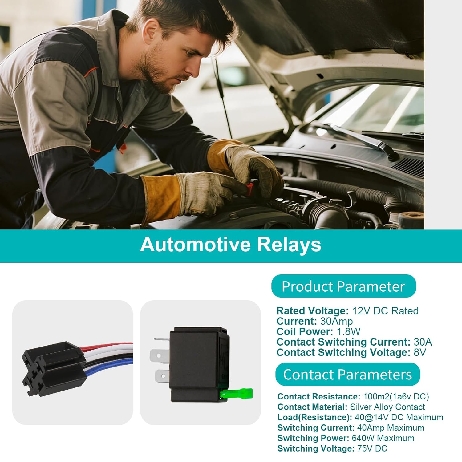 Easy to install and durable: 4 pin 12v 30a relay harness Adopts standard 4-pin SPST relay structure, supporting 12V DC (up to 14V) voltage and up to 30A switching load capacity. Each 30 amp relay 12v comes with a metal mounting bracket for easy and secure fixing in the right place in the car, quick and effortless installation