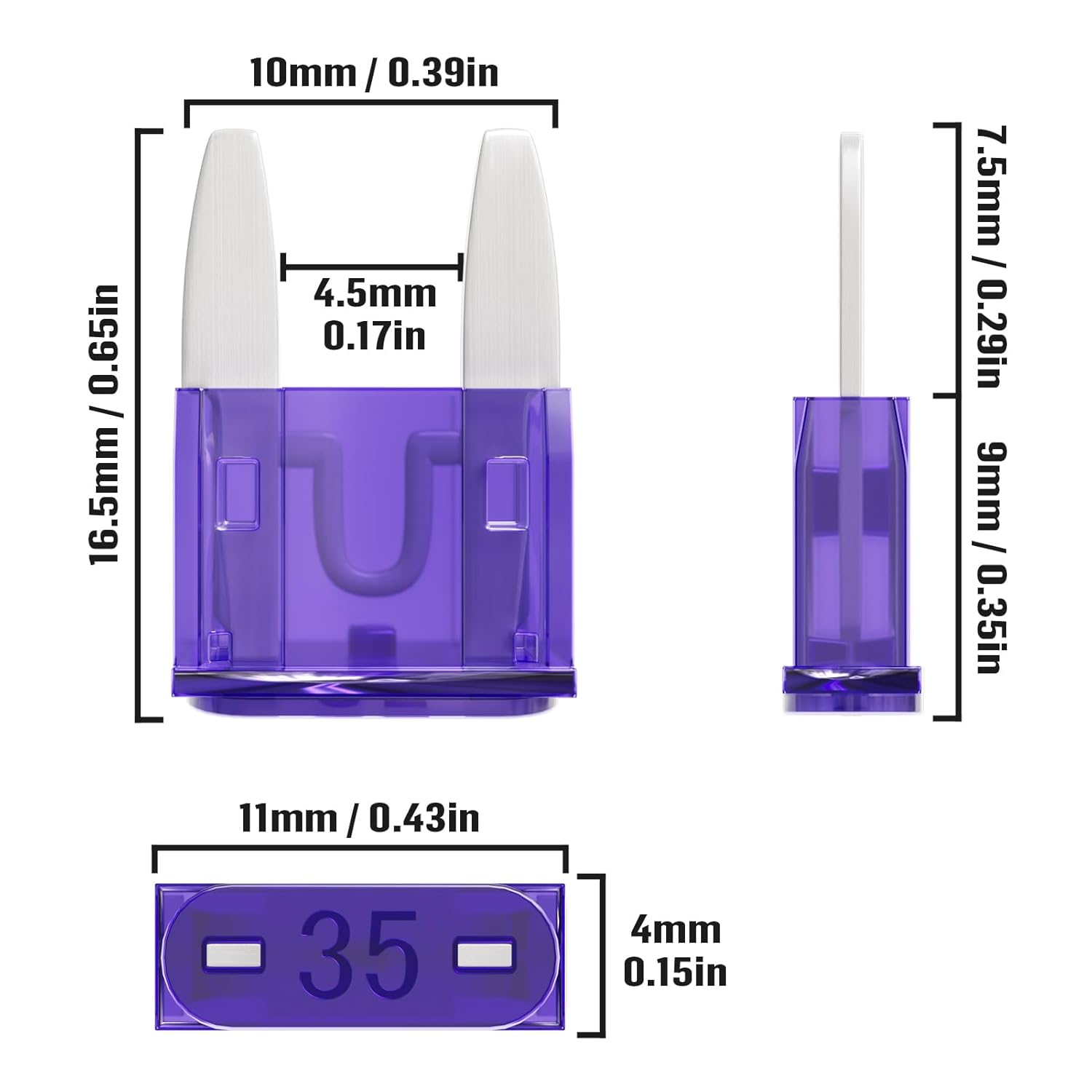 Model Mini Fuses Ampere Ratings 35 Amp Voltage Ratings 32 VDC Material Zinc alloy