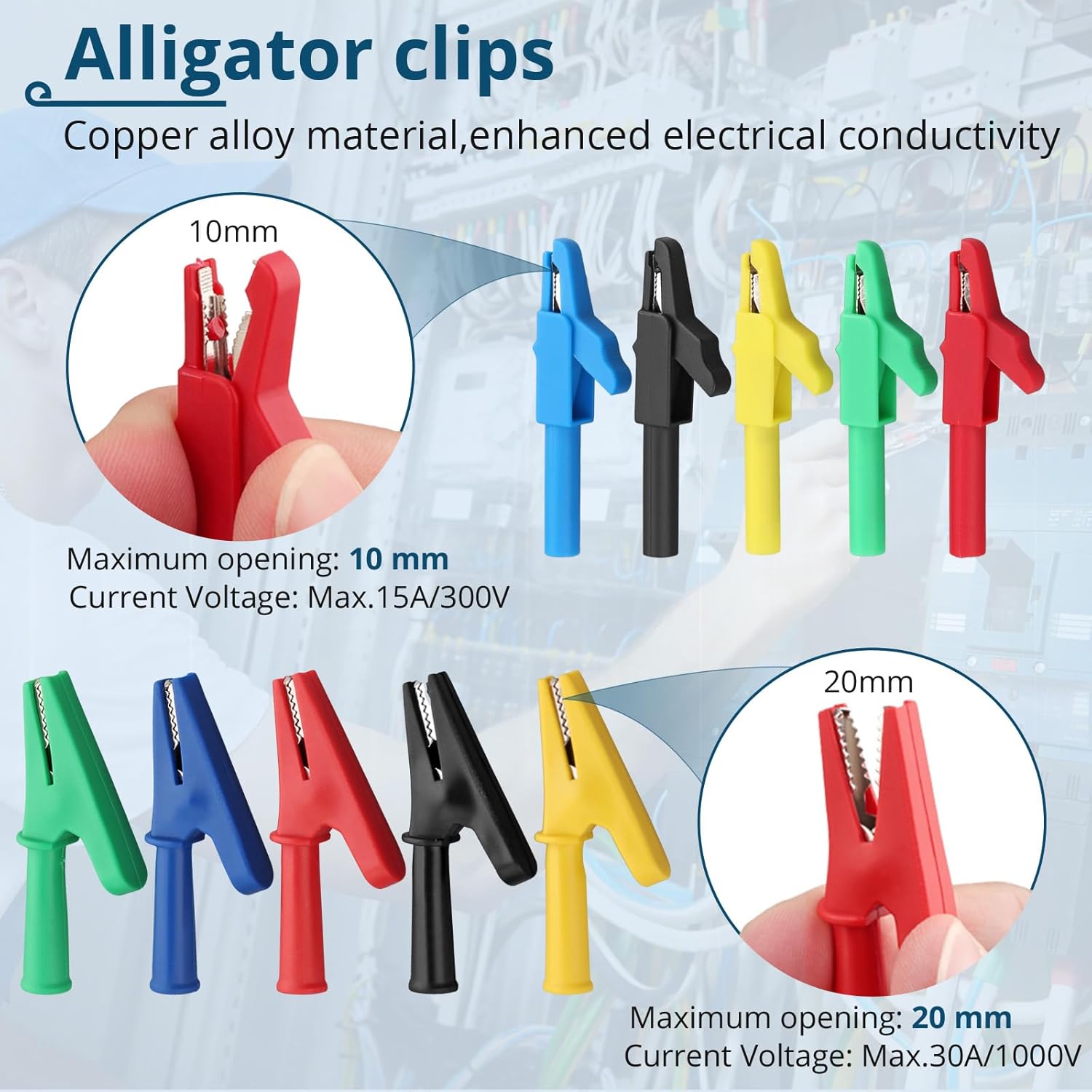 Enhanced Connectivity with Alligator Clips: The Test Lead Set includes 5 large alligator clips, providing increased stability and safety in connections. This is a practical feature for professionals conducting frequent tests. The kit also includes 5 extra wire piercing probes, allowing wire penetration without the need to strip cables, significantly improving work efficiency