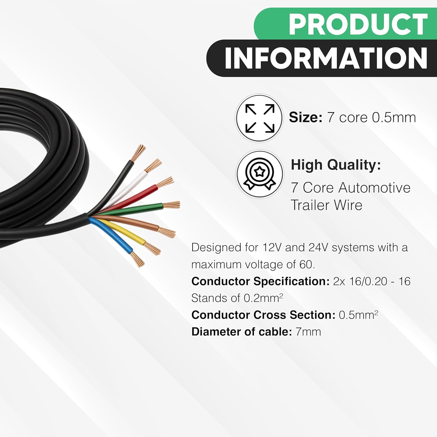 7-Core Automotive Cable: Rated to 11 & 16.5 Amps, ideal for trailer wiring and a variety of 12v/24v automotive installations requiring 7-core cables.Color-Coded Cores: Features red, brown, black, green, blue, yellow, and white cores for easy identification during wiring projects.High-Quality Construction: 7×16 & 32/0.20 conductor specification with a conductor cross-section of 0.5-1.0mm² for reliable performance and durability.Compact Design: Black sheath with a maximum overall cable diameter of 7mm, ensuring easy installation and routing in tight spaces.Versatile Use: Perfect for trailers, caravans, or any vehicle requiring multi-core wiring solutions. Designed to handle automotive and electrical installations with precision and reliability.