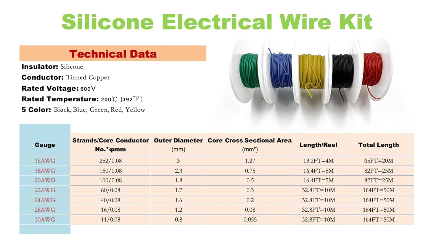 Technical Data Insulator: Silicone Conductor: Tinned Copper Rated Voltage: 600V Rated Temperature: 200℃(392℉) 5 Color: Black, Blue, Green, Red, Yellow