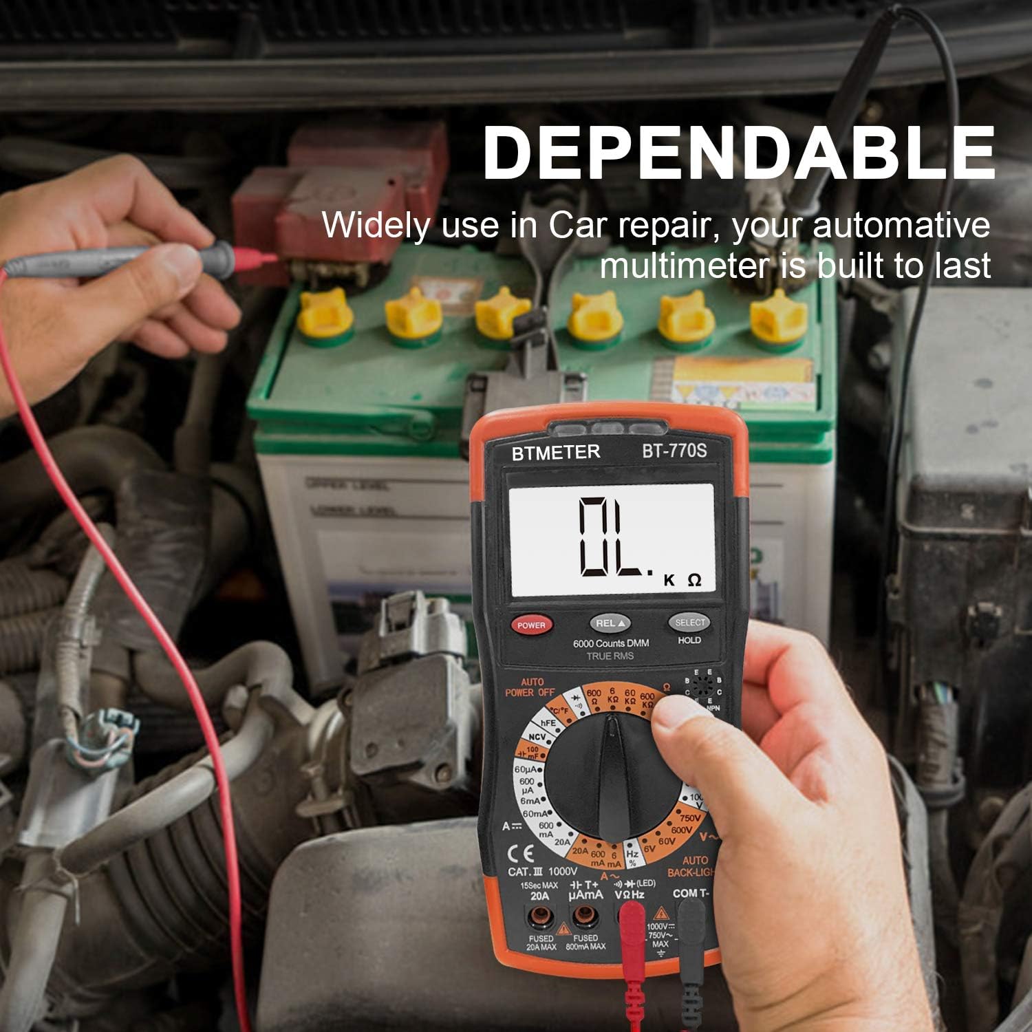 【What you get】You will have 1 x TRMS digital multimeter with 9V battery , 1 x test lead, 1 x thermocouple temperature probe, 1 x Crocodile clip, 1 x Protective bag,1 x user manual. BTMETER Provide 7*24 hours technical support to let you buy this digital multimeter confidently.