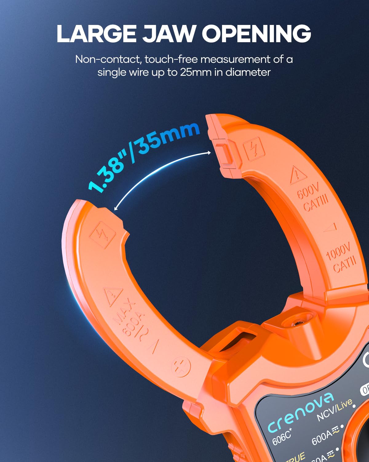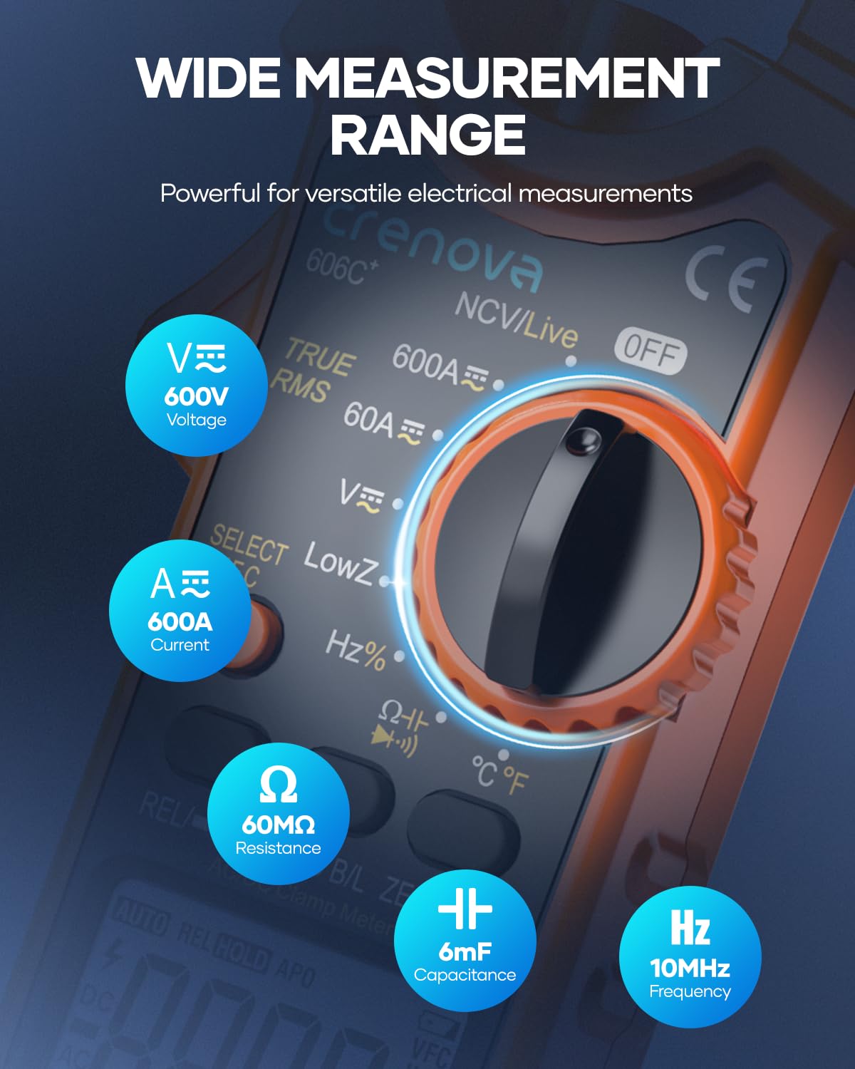 1.Versatile Clamp Meter: Quickly and safely measures AC/DC current up to 600A, AC/DC voltage up to 600V, resistance up to 60MΩ, capacitance up to 6mF, and frequency up to 10MHz; tests duty cycle, continuity, and diode; detects AC voltage (NCV, 48V to 250V) and live wire (AC 110V to 380V) with audible alarm, Crenova clamp meter was born for professional electricians.