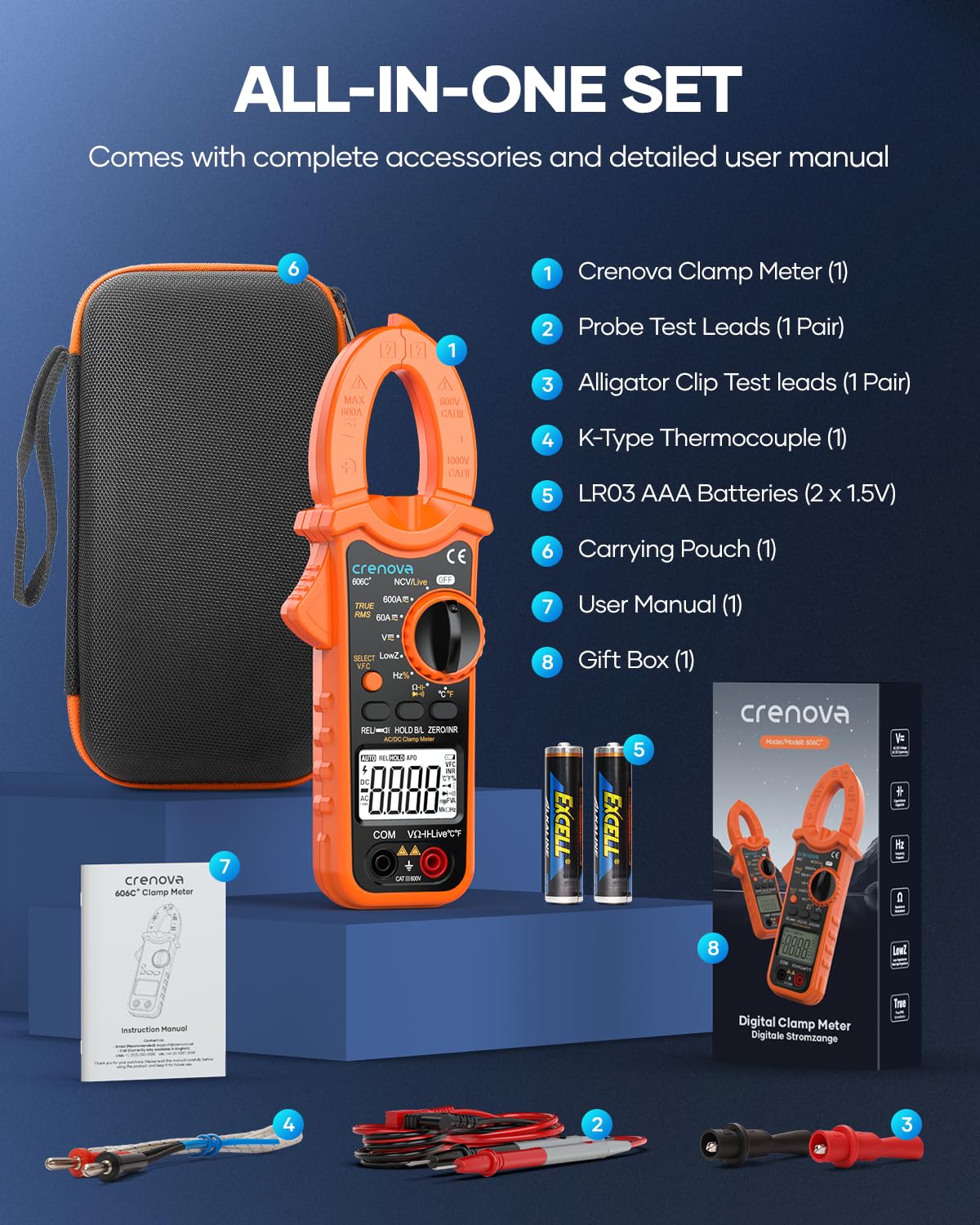 6.All-in-One Set: Includes 1 Crenova clamp meter, 1 pair of probe test leads, 1 pair of alligator clip test leads, 1 K-type thermocouple, 2 LR03 AAA batteries (2 x 1.5V), 1 carrying pouch and 1 user manual. All must-have items are well organized in a beautiful box, it is an awesome gift for birthday, anniversary and festival.
