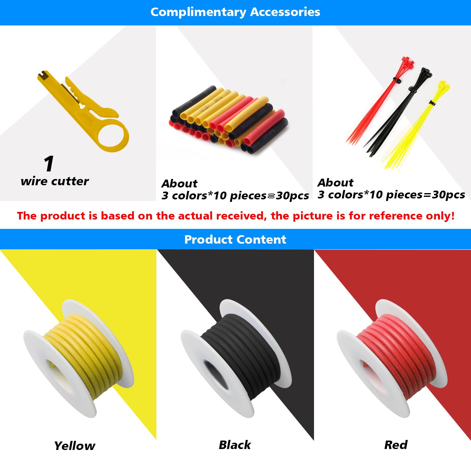 Comprehensive Package: Our package includes 10ft of each color (total 30ft), along with heat shrink tubings and 4-inch wire ties and wire cutters, providing everything you need for secure connections and tidy cable management