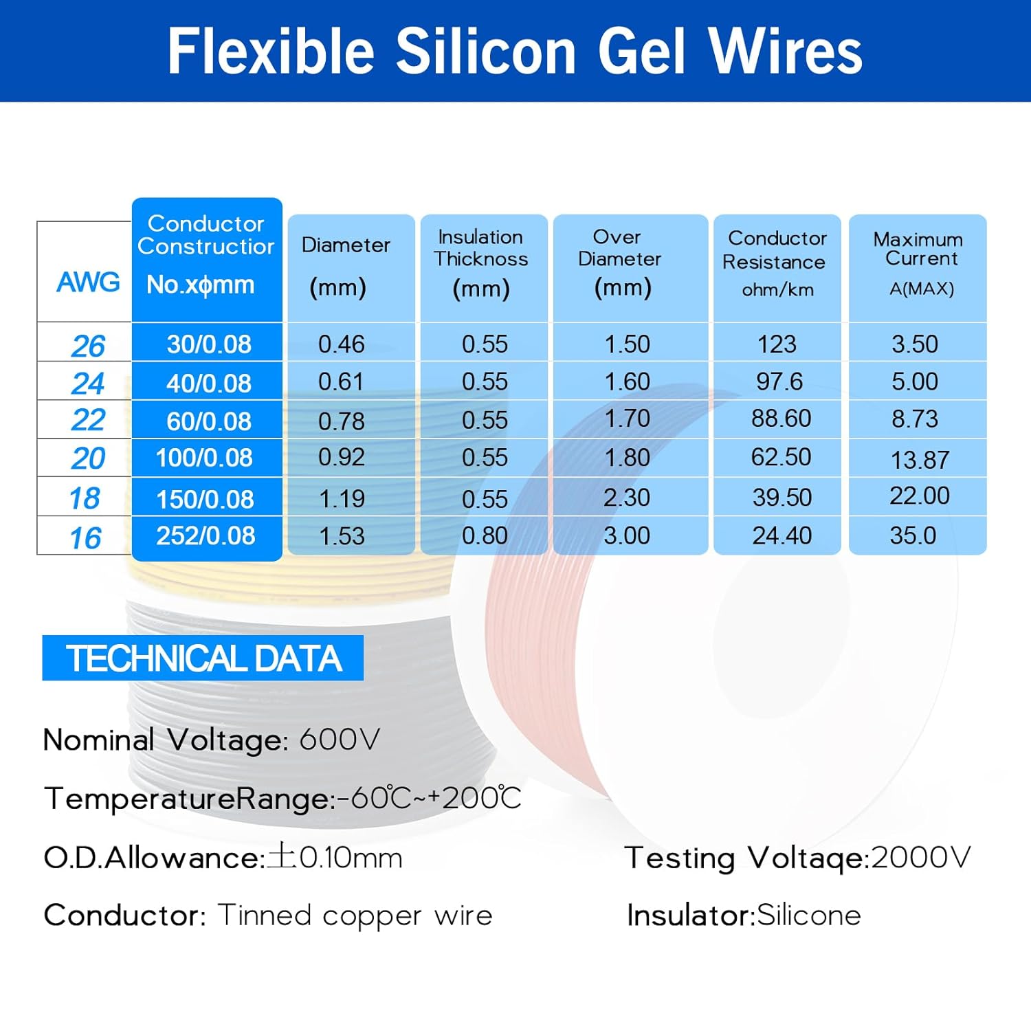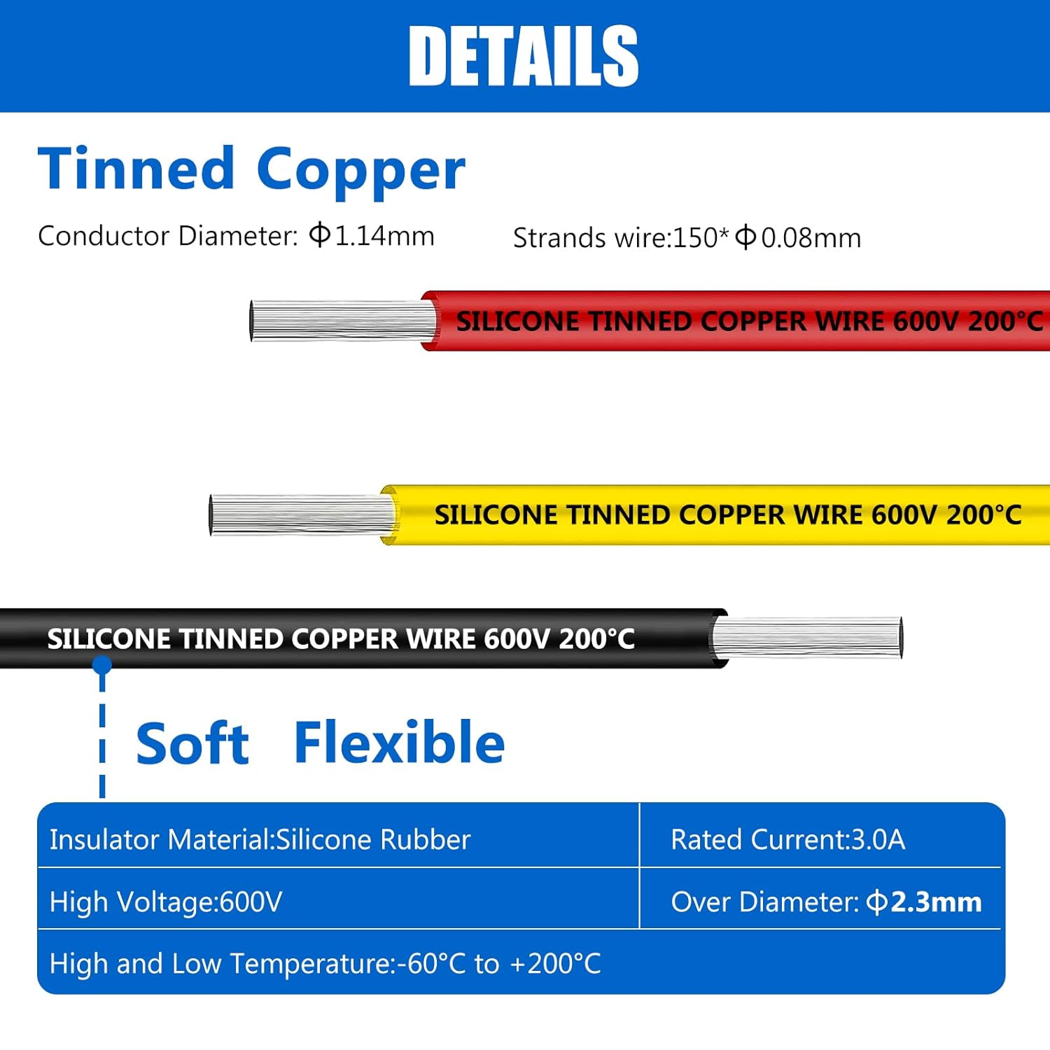High-Quality Materials: Made with high-purity oxygen-free tinned copper wire and silicone rubber insulation, ensuring optimal conductivity, low resistance, and durability. It withstands temperatures from -60°C to +200°C and has a voltage rating of 600 Volts