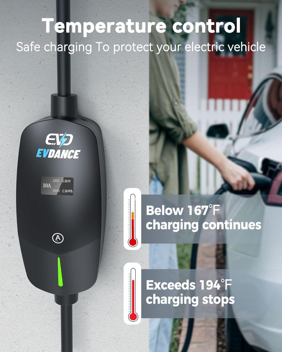 REAL-TIME LCD DISPLAY – Built-in screen shows live charging status. Automatically stops when charging is complete. Safety features include PEN fault detection, over/under voltage protection, overheating cutoff, and 30mA AC leakage protection.