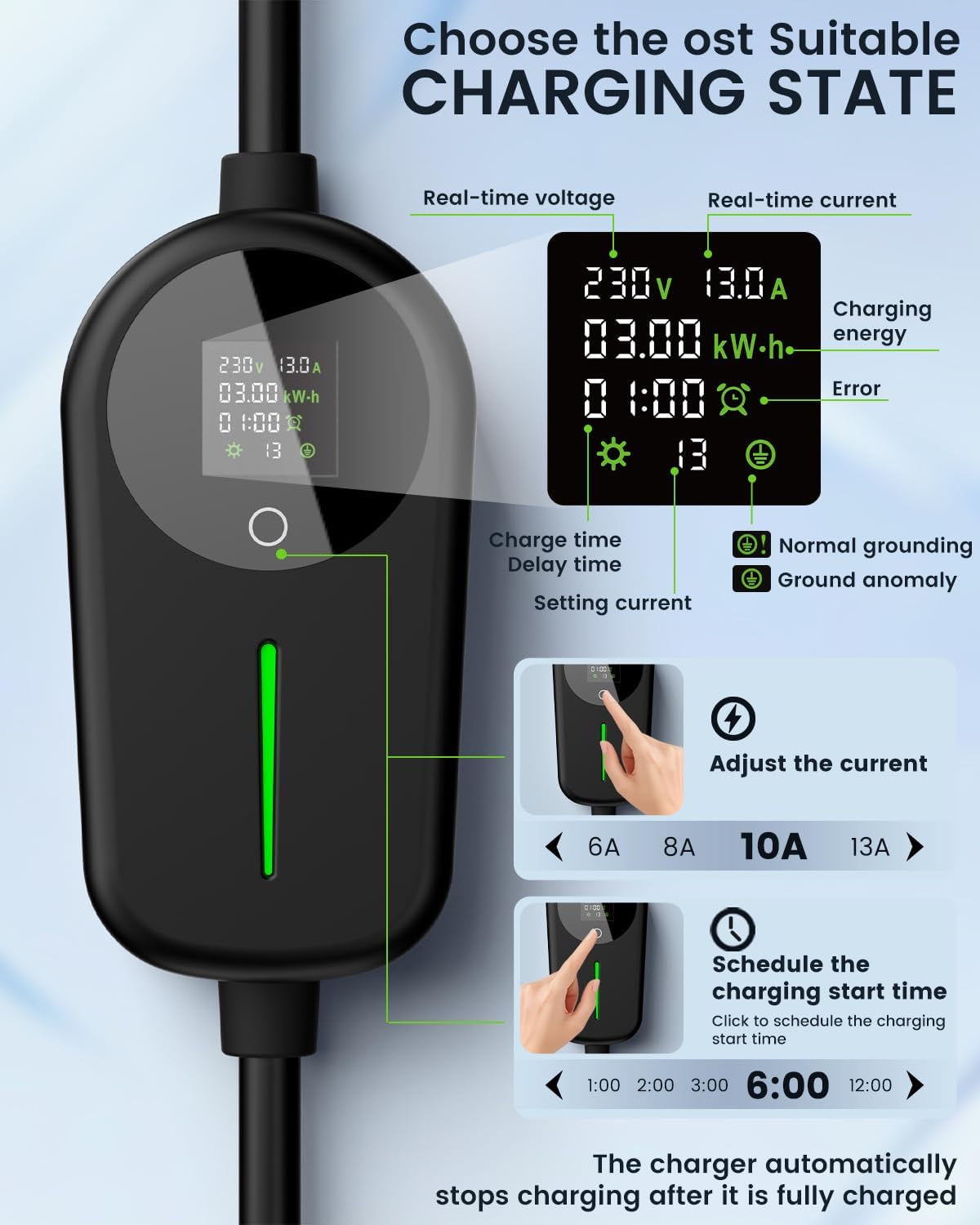 LCD display: EV charger features a screen for real-time charging status monitoring. The 3 pin EV charger screen allows adjustable current (6/8/10/13A), with 13A for occasional fast charging, 10A/8A for regular charging, and 6A for special situations. Electric Vehicle Charging Stations also supports scheduled charging (1-12 hours), enabling charging to start during off-peak electricity rates, effectively reducing charging costs.