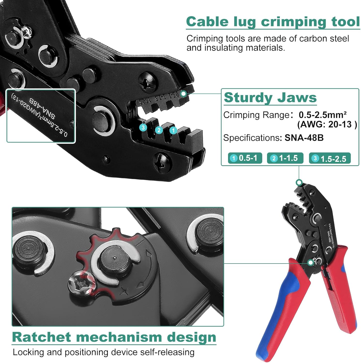 Cable lug crimping tool: The crimping tool is made of carbon steel and insulation material. The design of the ratchet mechanism helps reduce the force to achieve good crimping. Specifications: SNA-48B: Applicable range 0.5-2.5mm2(AWG 20-13)