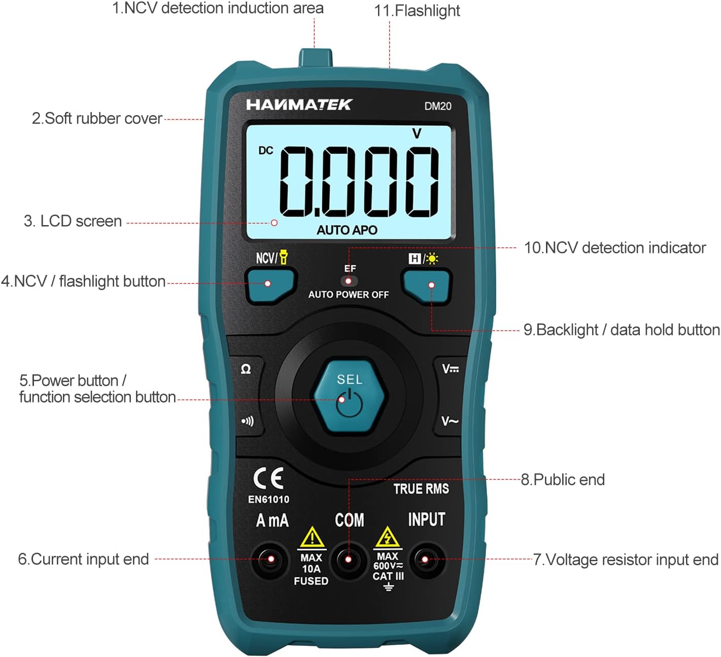 👍6000 counts and multifunction: HANMATEK DM20 Digital Multimeter has 4000 display counts and measures AC / DC voltage and current, diode, resistance, frequency, peak on / off, NCV non-contact voltage detection, wire discrimination live, auto range.