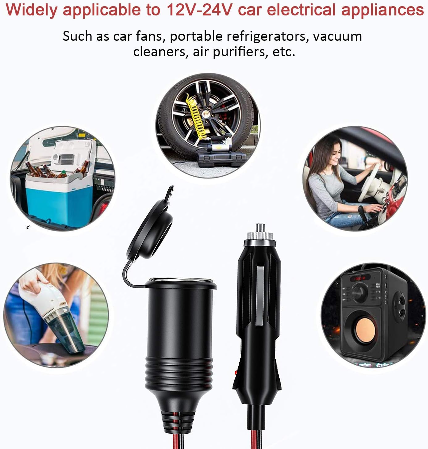 Wide application: suitable for various 12V/24V vehicle equipment, tire air pump, vehicle audio, vehicle vacuum cleaner, vehicle refrigerator, vacuum cleaner, air compressor, cooler, etc.; widely used in cars, RVs, boats, trucks, jeeps, etc.
