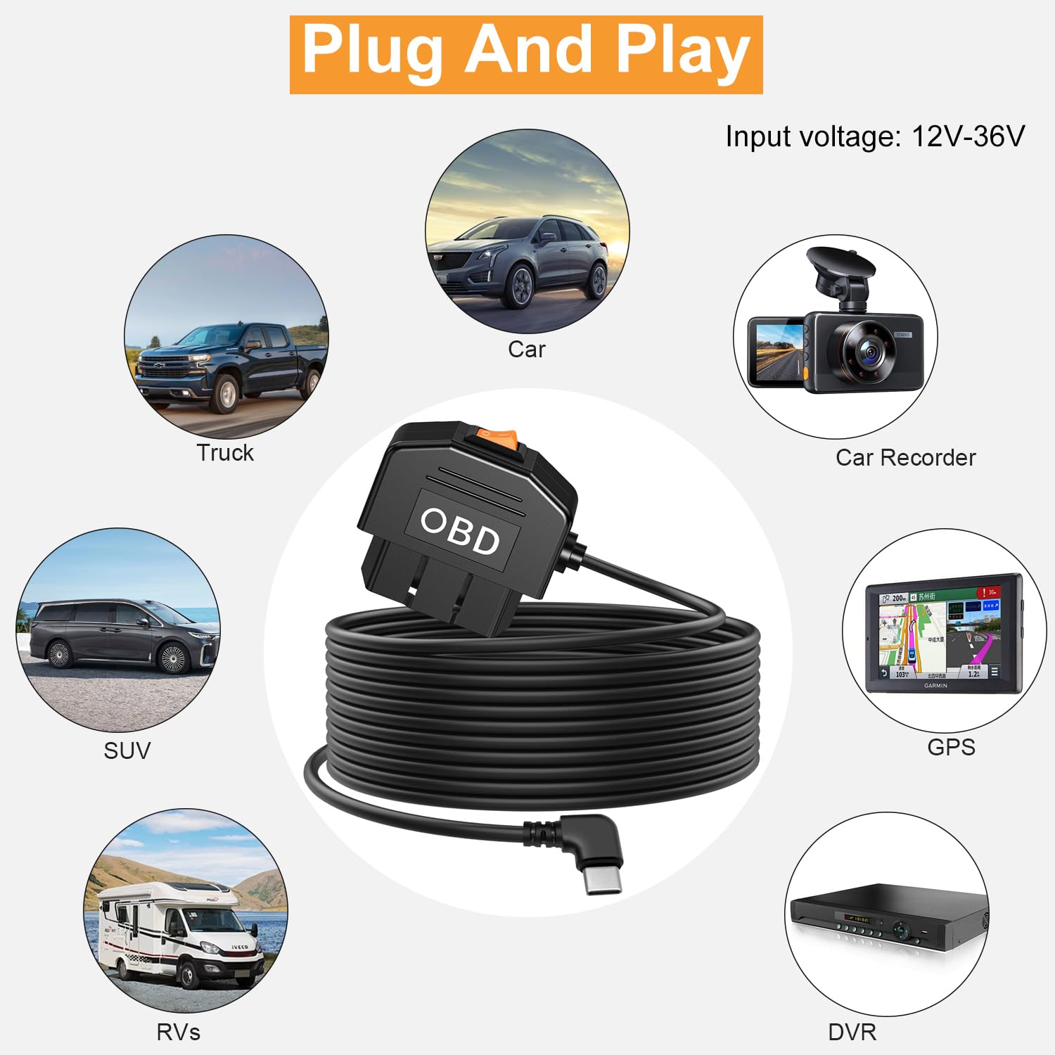 USB-C Car OBD Power Cable: The OBD power cable draws power directly through the car OBD2 interface, no need to occupy a cigarette lighter socket, and supports dash cams, GPS navigators, DVRs, radar detectors, and more electronic devices with mini USB ports. Compatible with electric vehicles, hybrid electric vehicles and fuel vehicles, it works according to vehicle vibration.
