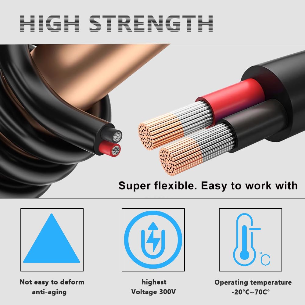 Wire Guage: 22/18/16/14AWG Max Voltage: 300V,Mainly for 12/24V Color: Red&Black,Black PVC Jacket Red wire:Positive(+) Black wire:Negative(-) Material: Anti-oxydation Tinned Copper + PVC Temperature : -40℃-80℃