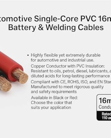 Automotive Single-Core PVC 16mm² Battery & Welding Cables: Highly flexible yet extremely durable for automotive and industrial use.