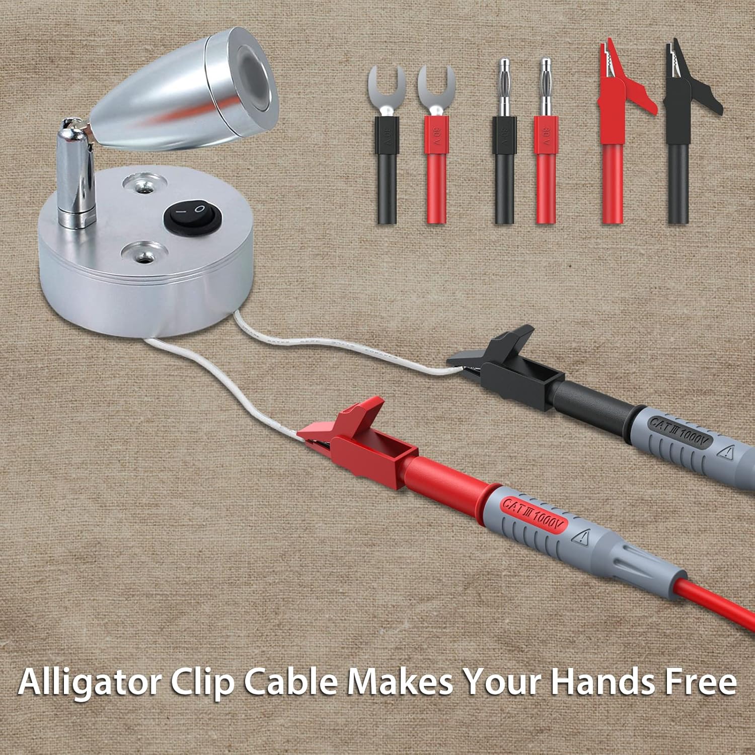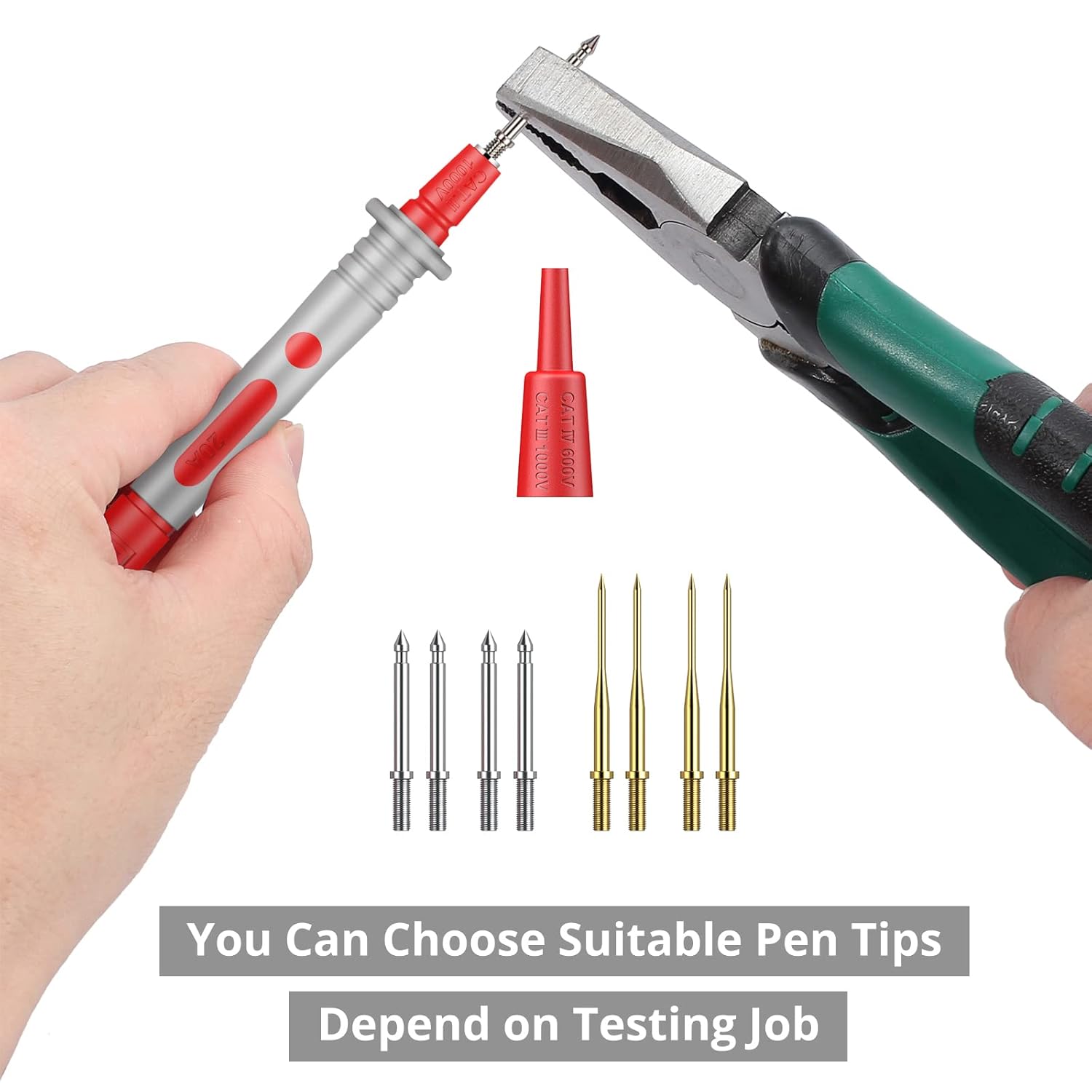 【8 PCS Interchangeable Test Probes】 — Our Test Probes Feature Rubber Overmolded Surfaces that Improve Steadiness in Slippery Hands, while the Extra 8pcs Interchangeable Probe Tips (Nickel-Plated and Gold-Plated) Allow for Improved Accuracy and Access to Tight Spaces