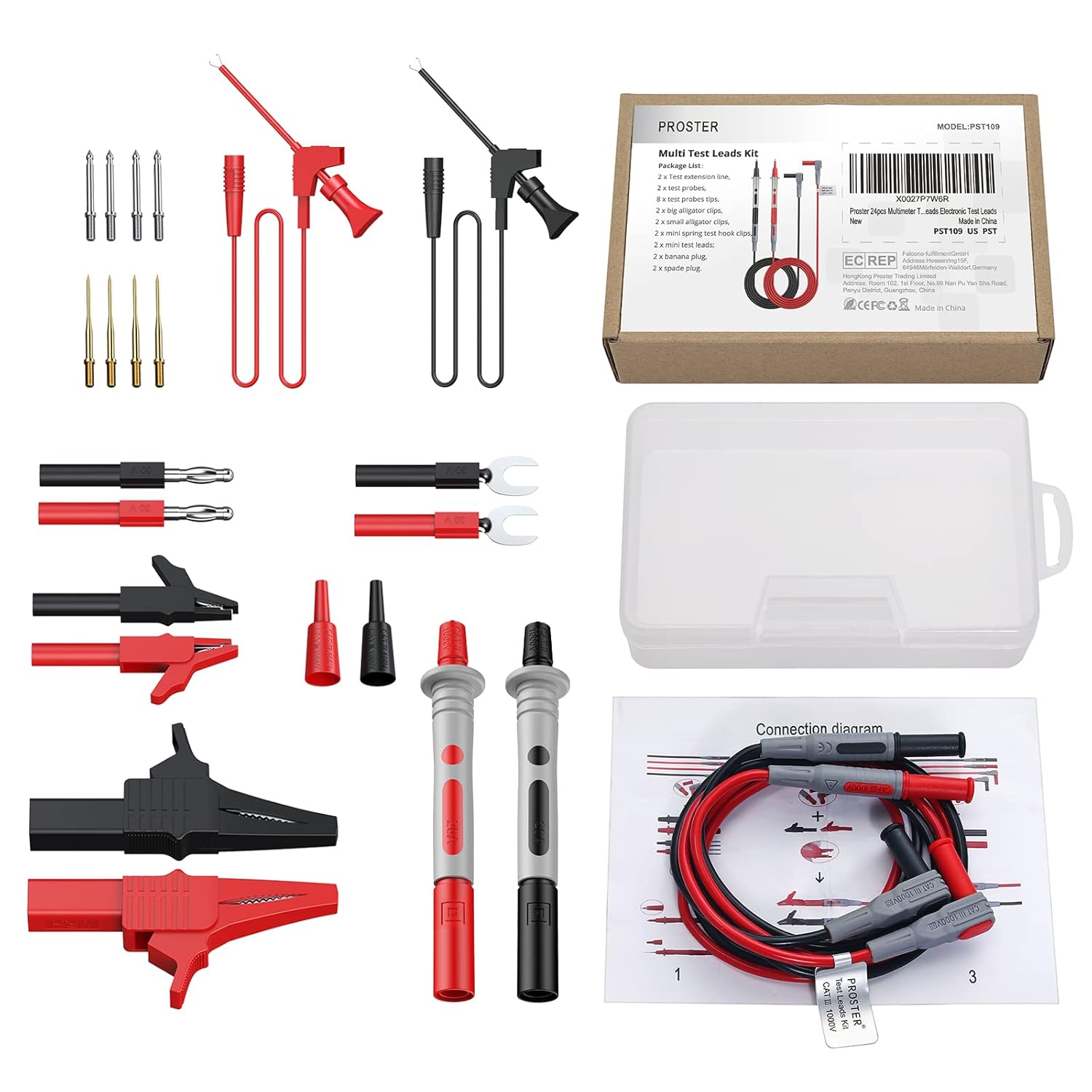 Proster Multimeter Test Leads Kit – 24 in 1 Automotive Test Leads with 8 PCS Probe Pins Alligator Clips Spade Plug Banana Plug for Multimeter Clamp Meter
