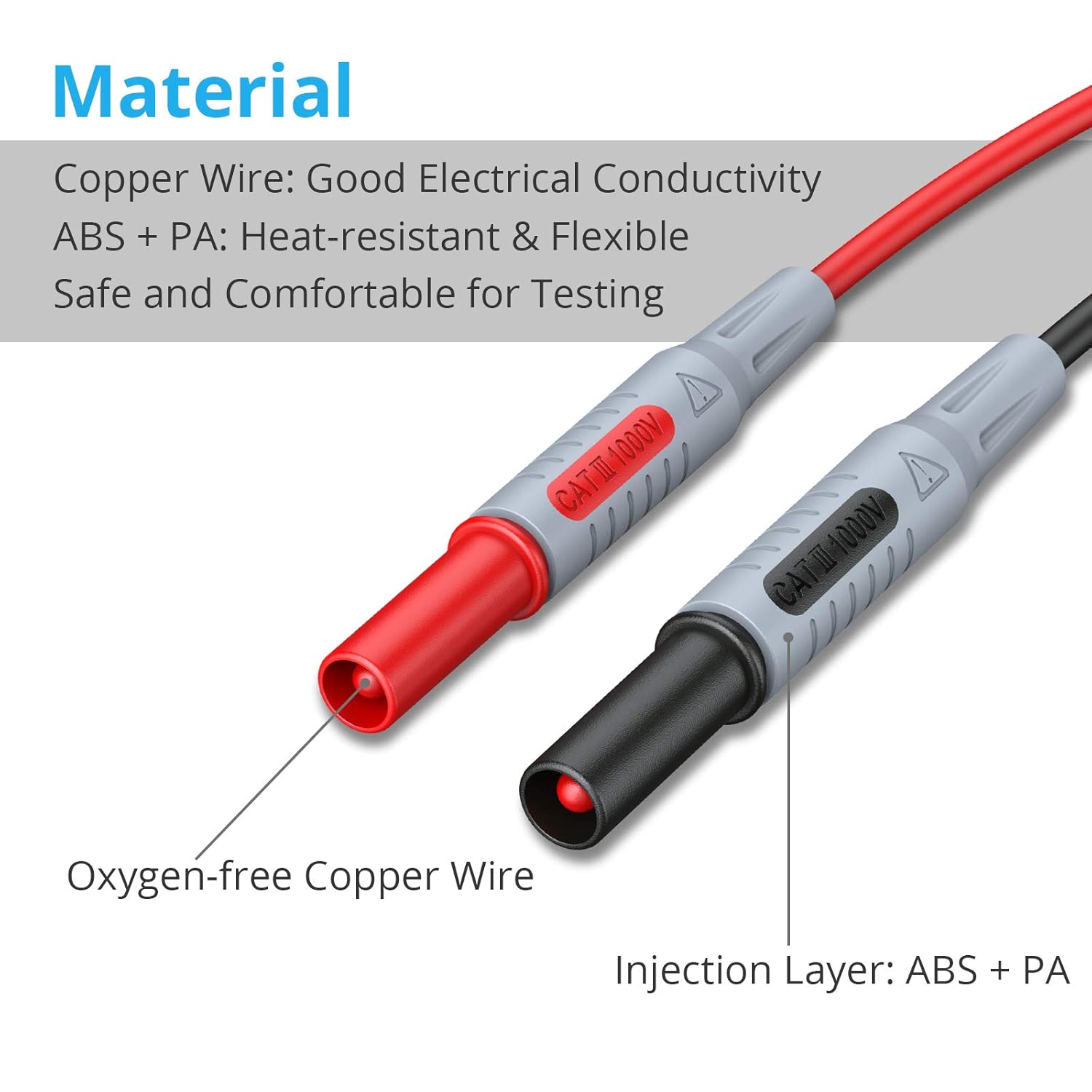【Crocodile Clips, Banana Plug & Spade Terminal Connectors】— Crocodile Clips are Shrouded in ABS+PA Insulation Shell for Safety, While the Serrated Material Provides a Firm Grip and Prevents Slipping. Banana Plug and Spade Terminal Connectors Expand Your Testing Capability and Flexibility, Allowing for a Broad Testing Scope
