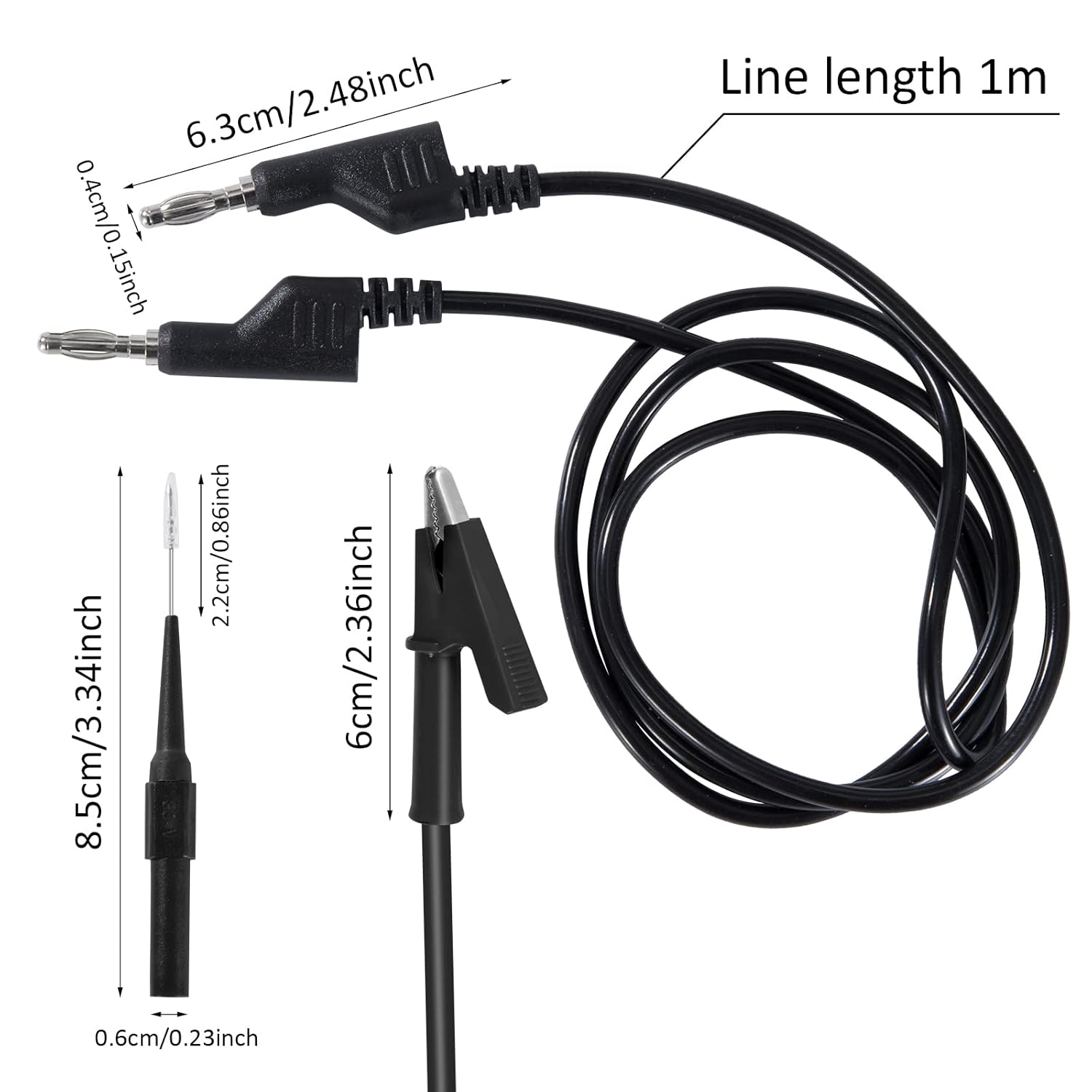 Alligator Clips Test Leads: Nickel-plated copper alligator clip and 4mm banana plug with PVC non-slip insulating cover, strong bite force, open width 10mm, good conductivity and corrosion resistance. Wire length: 1m, Voltage/Current: 1000V/15A.