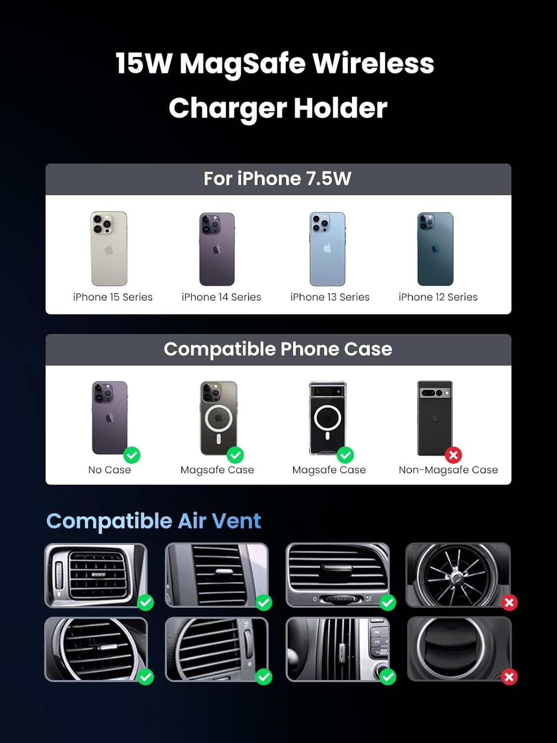 Designed For iPhone Series: The Magnetic car mount charger is compatible with iPhone Air/17/16/15/iPhone 15 Plus/15 Pro/15 Pro Max/14/14 Pro/14 Plus/14 Pro Max/13/13 Pro/13 Pro Max/13 Mini/12/12 Pro/12 Pro Max/12 Mini, etc. Please kindly note that for better using experience, if you’re using a phone case, please make sure to use authorized Magnetic phone case