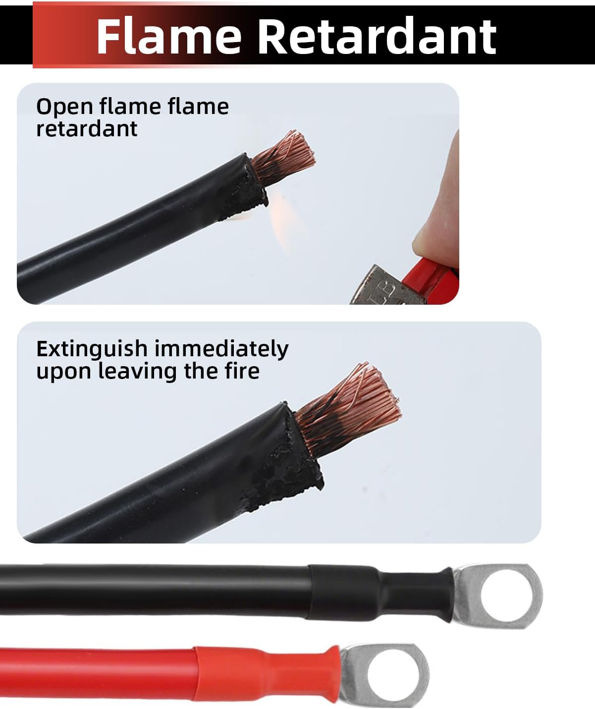 【Fitted with M10 Ring Terminals】 Each cable is equipped with 10mm inner diameter ring terminals at both ends, allowing quick and secure connection to standard battery posts, inverters, or fuse blocks.