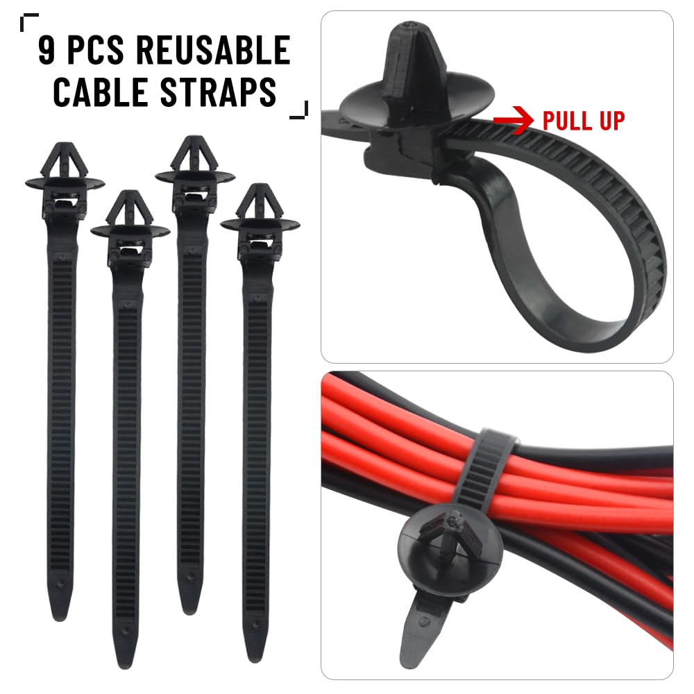 9PCS Wire Loom Routing Clip 1/4″ I.D. 3/8″ O.D.Fits Conduit Size: 1/4″ I.D., 3/8″ O.D.9PCS Wire Loom Routing Clip 11/32″ I.D. 1/2″ O.D.Fits Conduit Size 11/32″ I.D., 1/2″ O.D.Fits 1/4″ Hole9PCS Wire Loom Routing Clip 13/32″ I.D. 19/32″ O.D.Fits Conduit Size 13/32″ I.D., 19/32″ O.D.Fits 1/4″ Hole9PCS Wire Loom Routing Clip 1/2″ I.D. 11/16″ O.D.Fits Conduit Size 1/2″ I.D., 11/16″ O.D.Fits 1/4″ Hole9PCS Wire Loom Routing Clip 3/4″ I.D. 1″ O.D.For Conduit Size: 3/4″ I.D., 1″ O.D. Fits 1/4″ Hole9PCS Cable Strap Overall Length: 140mm (5-1/2″)Maximum Bundle Diameter: 30mm. Fits Into 7mm Hole