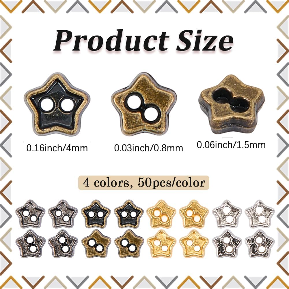 Size: Two hole star buttons is about 0.16×0.16×0.06 inch( 4x4x1.5mm) , hole: 0.03 inch( 0.8mm), 50pcs one color, 200pcs in total