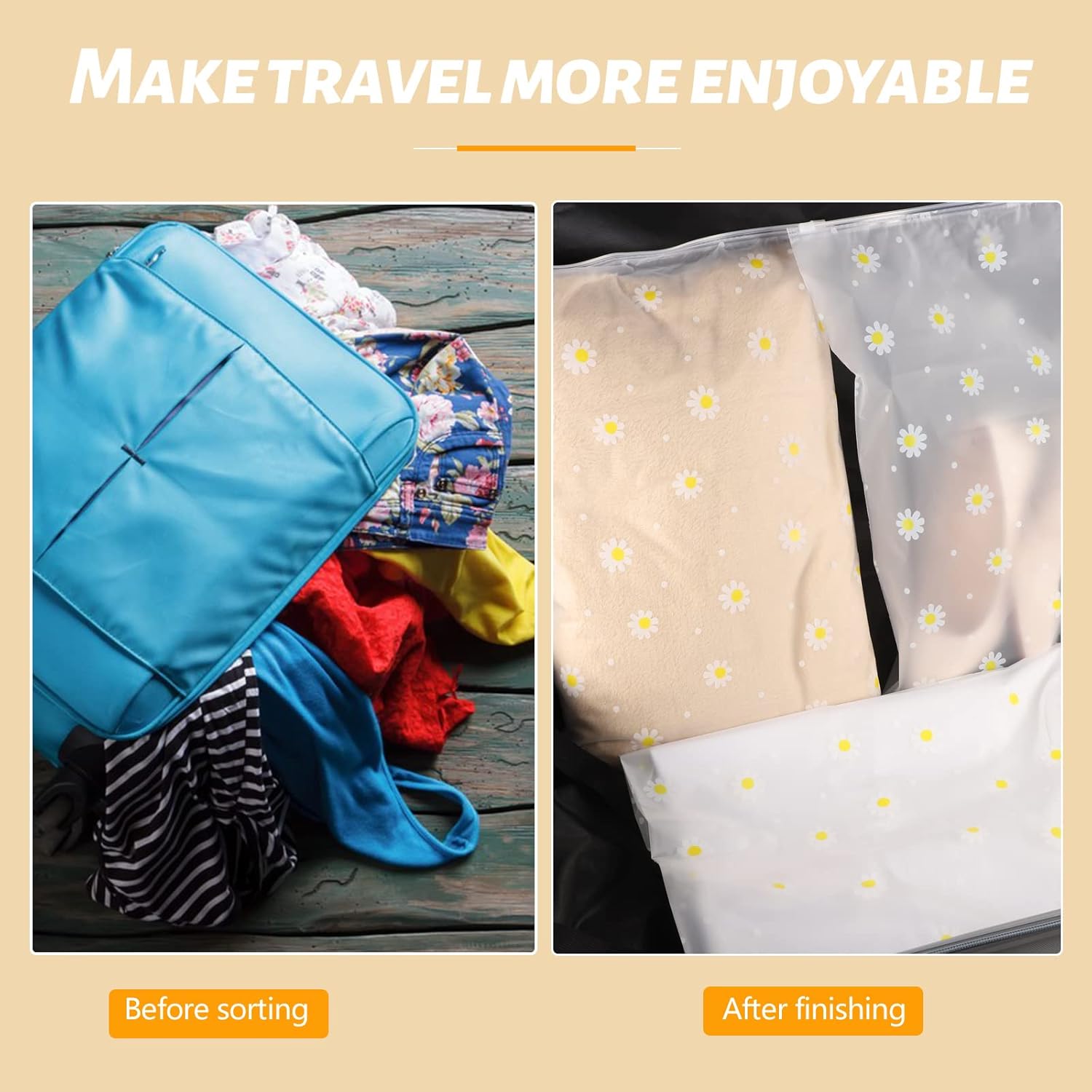 Durable and Waterproof: The travel storage bag is made of plastic with cute daisy patterns on the surface, matte texture, it will not tear easily, durable and waterproof, it can protect clothes and items well.