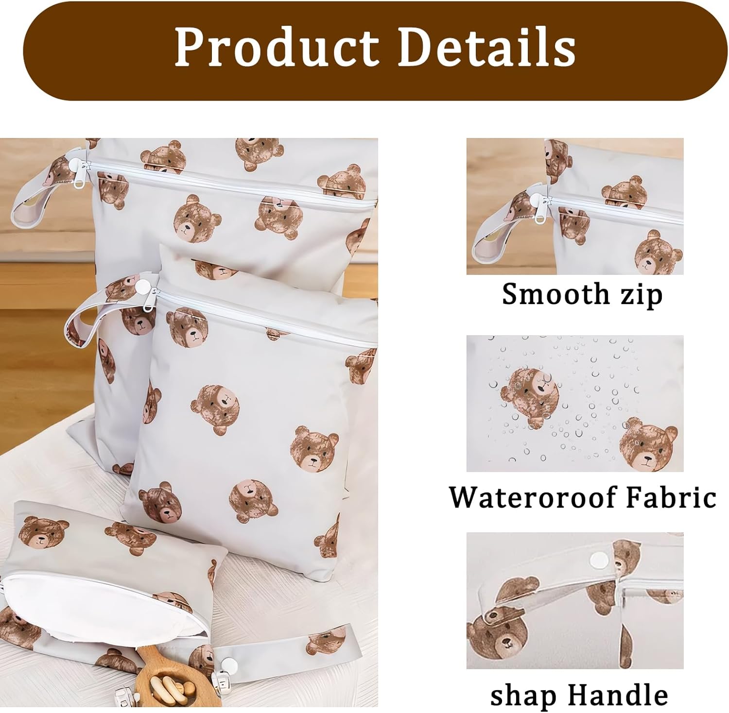 Practical Set: This nappy bag set includes three bear pattern wet bags in different sizes, designed for versatile use; The waterproof material ensures dry and wet items stay separate, making it ideal for baby care and travel organization