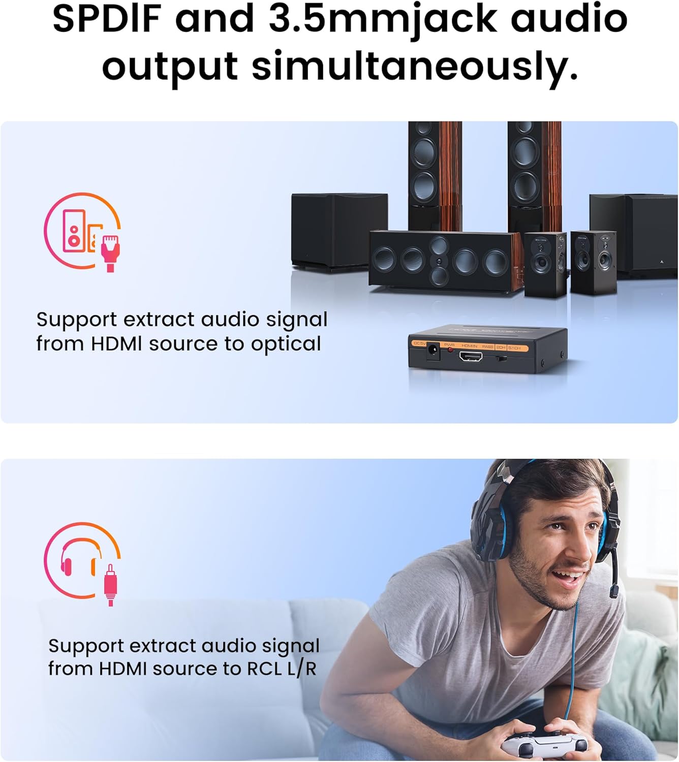 【Extract & Split Audio Effortlessly】 This HDMI audio splitter extracts digital audio from HDMI sources (like PS5, Sky Q, or Fire TV) and outputs via Optical Toslink (SPDIF) or RCA L/R, while passing the original 4K video to your TV/monitor. Ideal for connecting soundbars, AV receivers, amplifiers, or speakers. (Note: Does not support HDMI ARC.)