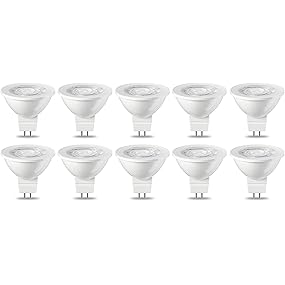 10-pack of 4.5-watt non-dimmable LED light bulbs Each replaces a 35-watt incandescent bulb Produces a soft, white glow (2700K) Lifespan of 15,000 hours Lasts 13+ years (based on 3-hour daily use) 345 lumens of light; achieves full brightness instantly Cap type: GU5.3 Beam angle: 36 degrees Colour consistency ≤6 Not recommended for enclosed fixtures Backed by an AmazonBasics limited one-year warranty