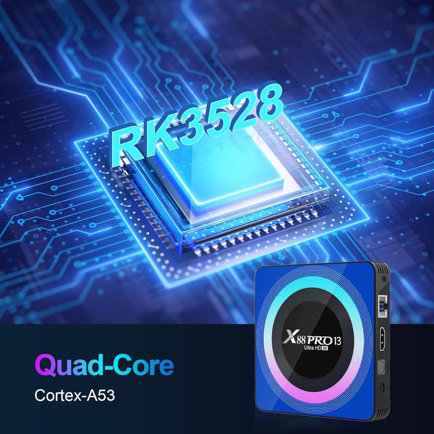 【Latest Android 13.0 OS】 The Android TV Box with the latest Android 13.0 operating system on the market, which is powered by the RK3528 Quad Core Cortex A53 ultra high frequency x CPU and ensures that the Android Box runs stable and smoothly to load movies, pictures and bufferless games that are compatible with the vast majority of Android APPs offer a better user experience than other Android TV boxes.