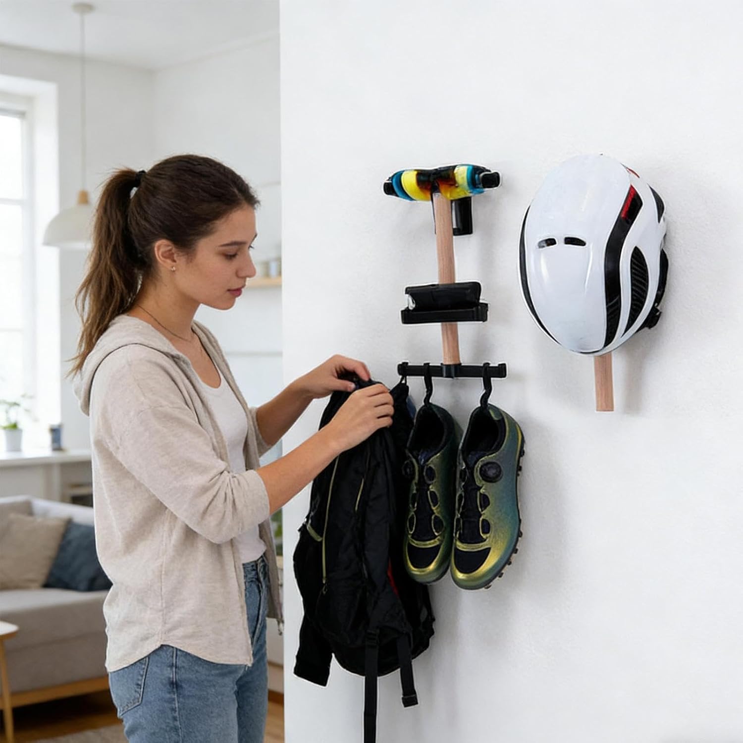 The Bike Gear Storage Organizer is designed to efficiently manage your bike accessories as it can be wall mounted, saving space in any area. This storage hanger provides a convenient solution for organising glasses, shoes and even your speedometer, keeping them neatly stored and easily accessible. This organizer is ideal for home, garage, living room, apartment or shed and ensures that your cycling gear stays tidy and does not end up on the floor. By using the wall space, clutter is avoided and the functionality of your storage areas is improved. The robust construction supports reliable use while complementing various interior styles. Expand your storage experience with this versatile bicycle gear storage organiser specially tailored to the needs of cyclists looking for order and comfort in their daily life.