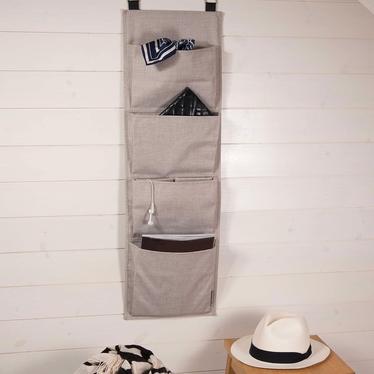 Bigso Box of Sweden Foldable Hanging Storage Organiser – Door and Wall Hanging Storage with 4 Compartments and Linen Effect – Hanging Storage Pockets for Shoes, Clothes, Accessories and More – Beige