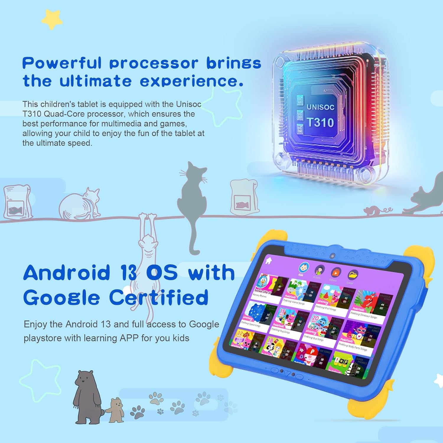 【Quad-Core Processor + Android 13】This child tablet is equipped with the Unisoc T310 (Quad-Core) is extremely fast and energy. with Android 13 system which is passed GMS certification and is pre-installed with the iwawa app, specially designed for children. Effective games and apps designed to provide innovative digital educational content for kids aged 3-15, learning from having fun.