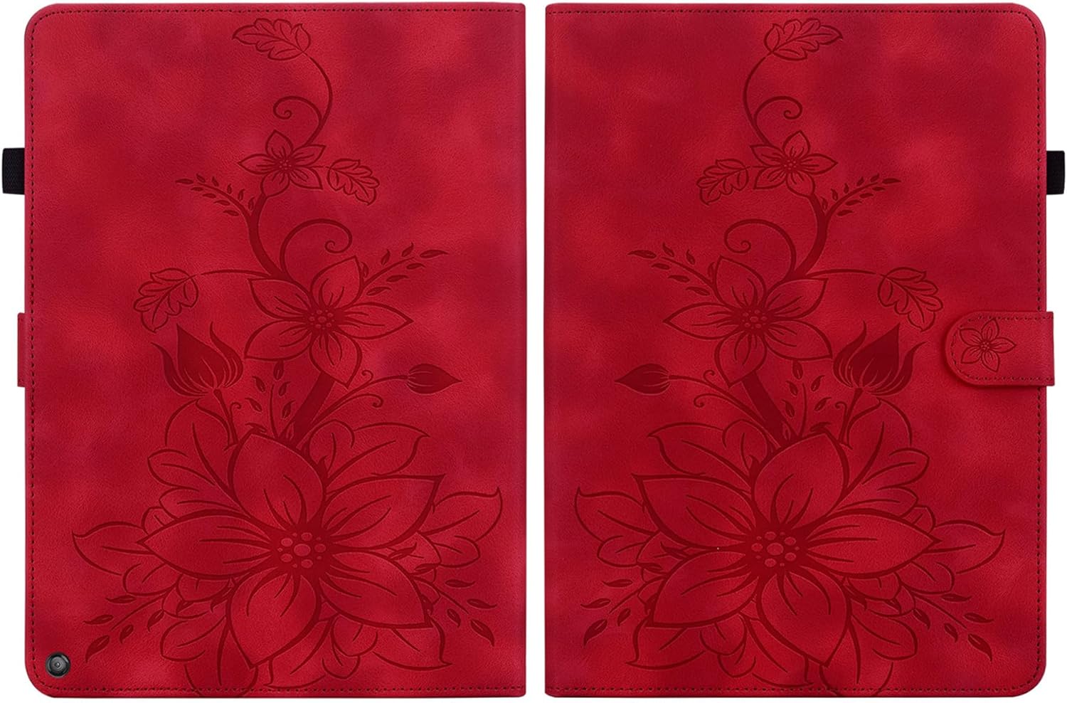 DayQiQiPu Case for Amazon Fire HD 10/HD 10 Plus (10.1 Inch, 11th Generation, 2021 Release) PU Leather Lotus Lily Flower Pattern Flip Tablet Case Card Slot Stand Protection Cover,Red