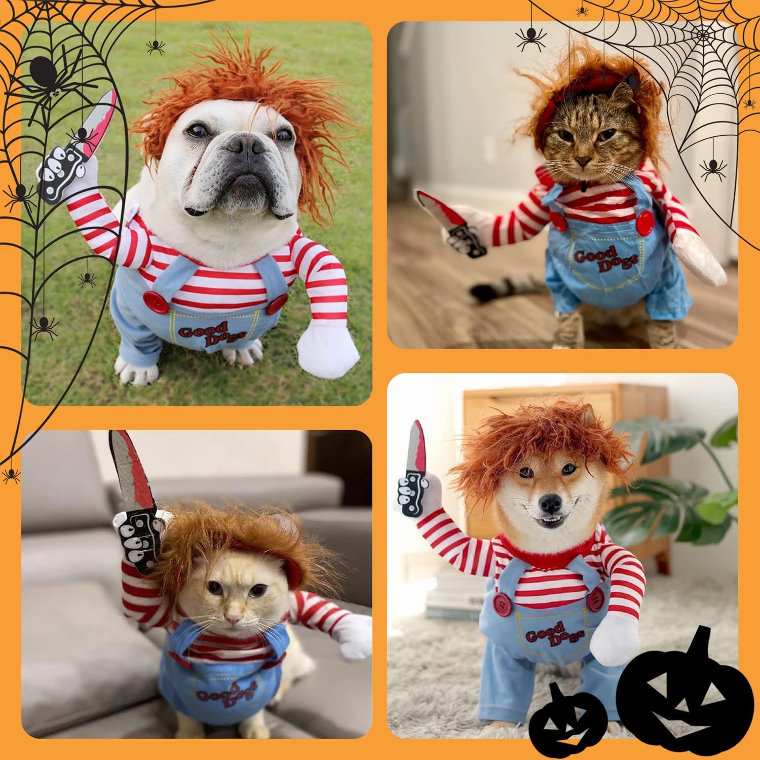 Dog Deadly Doll Costume – Pet Halloween Funny Chucky Cosplay Accessories with Wig & Knife, Christmas Party Cut Set for Puppy, Cat, Pug, Corgi, Shiba, M Size (G)
