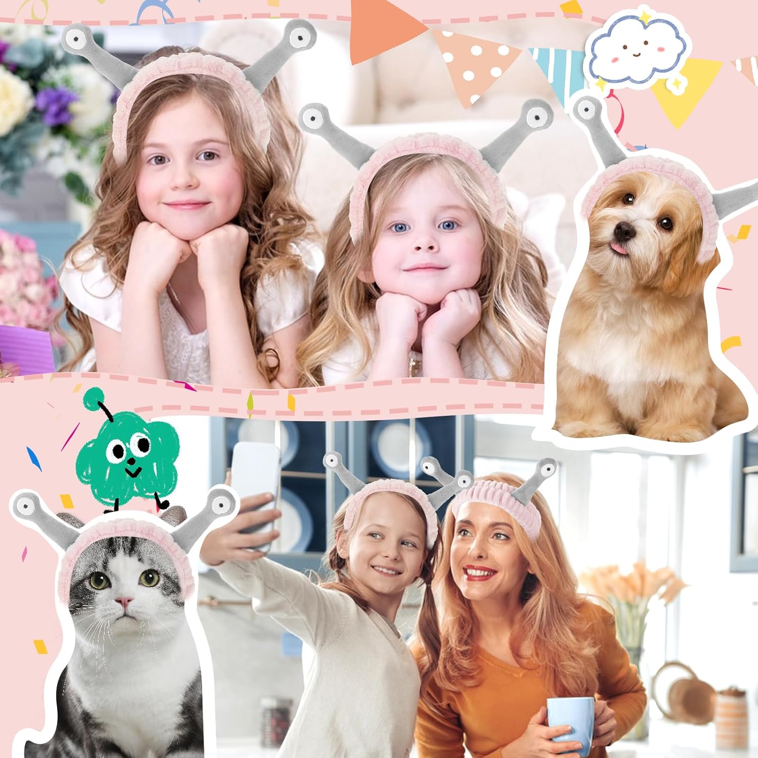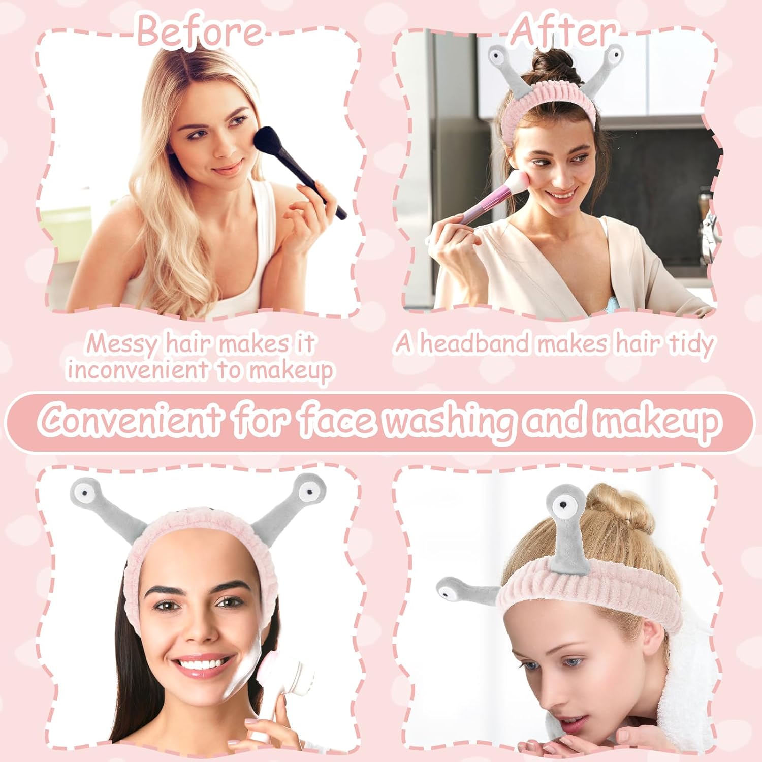 Face Wash Headband, Palm and Snail Spa Hair Bands Makeup Headbands Women Cartoon Cute Coral Fleece Elastic Headband Creative Hair Accessories for Washing Face Shower Sports (Pink&Grey)