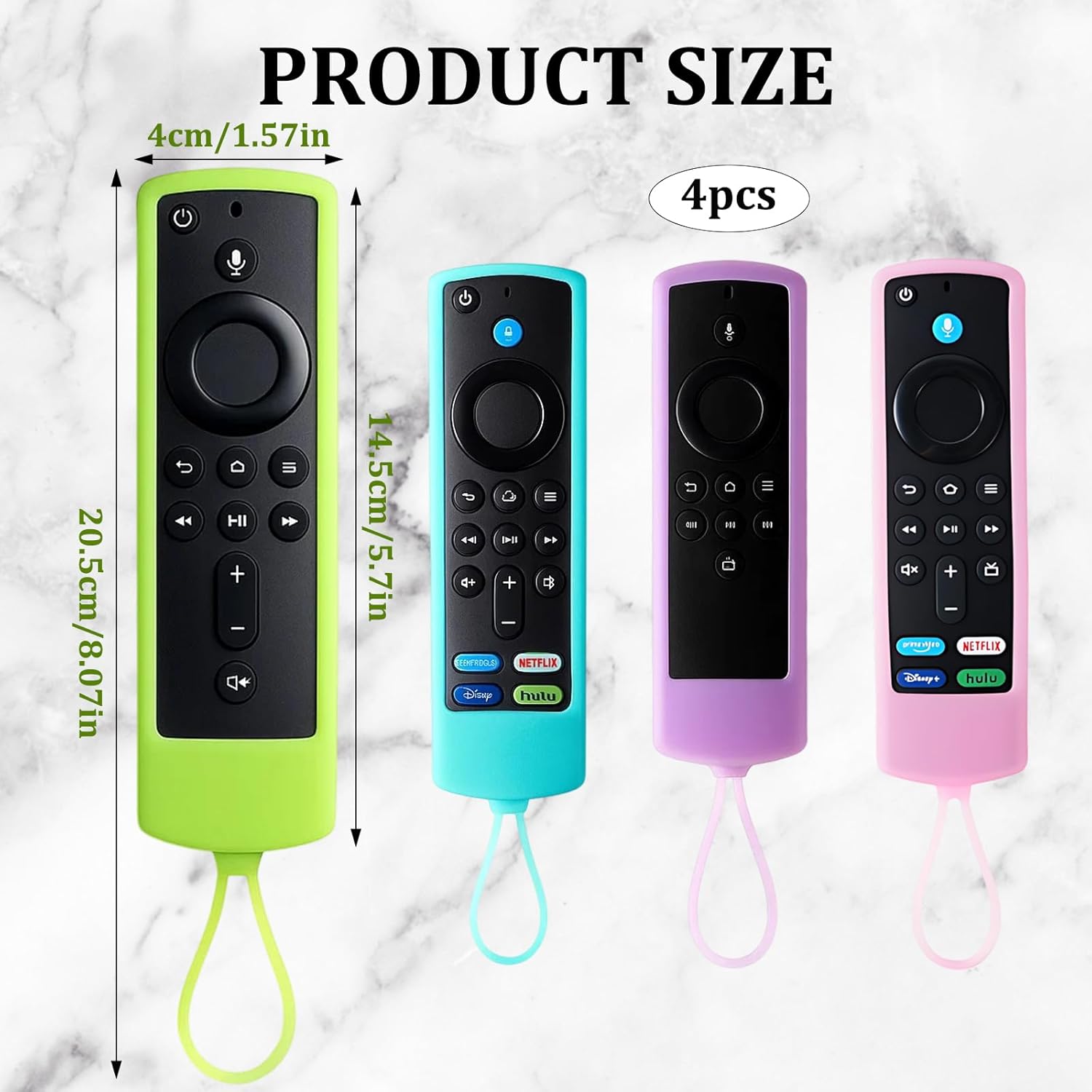 Fire Stick Remote Cover, 4 Pack Silicone Firestick Remote Cover, Fire TV Remote Cover Glow in The Dark with Non-Slip Design, Firestick Cover Fits Most Fire Stick Models, Includes Lanyard for Access Secure Protection: These fire stick remote covers are made from durable silicone to shield your remote from drops and scratches; The textured surface enhances grip for secure handling, reducing the risk of accidental slips Glow-in-the-Dark Feature: The firestick remote cover glows in low-light conditions, making it easy to locate your remote at night; Simply expose the cover to light briefly to activate the luminous effect for continuous visibility Full Button Accessibility: The fire tv remote cover has precise cutouts for all buttons and ports, ensuring unobstructed access; The slim design maintains the remote’s original functionality while adding an extra layer of protection Multi-Pack Convenience: Includes four remote covers, ideal for households with multiple remotes or as backups; Each firestick cover is designed to fit most Fire TV Stick models, providing versatile compatibility Enhanced Usability: Fire stick remote cover comes with a lanyard for easy access and storage; The soft silicone material is safe for children and pets, preventing accidental damage to your remote while ensuring a secure fit