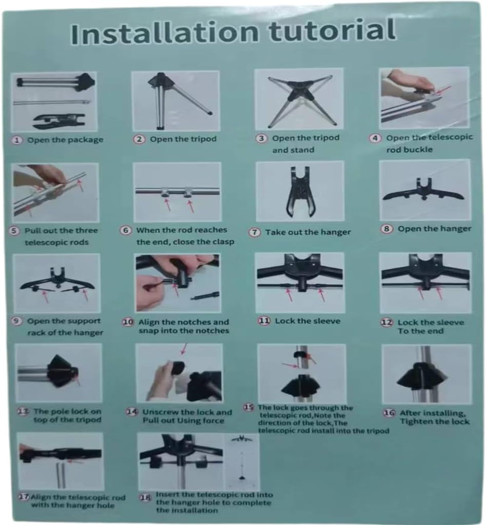 Telescopic Adjustable Height Versatile Drying & Garment Rack. Use for Laundry , Garment rack , Extra Closet, or Storage. Material: aluminum alloy + plastic Weight: 700g Bracket component: 4 foot bases (4 feet can be detached) 3 sections of telescopic rod foldable clothes hanger