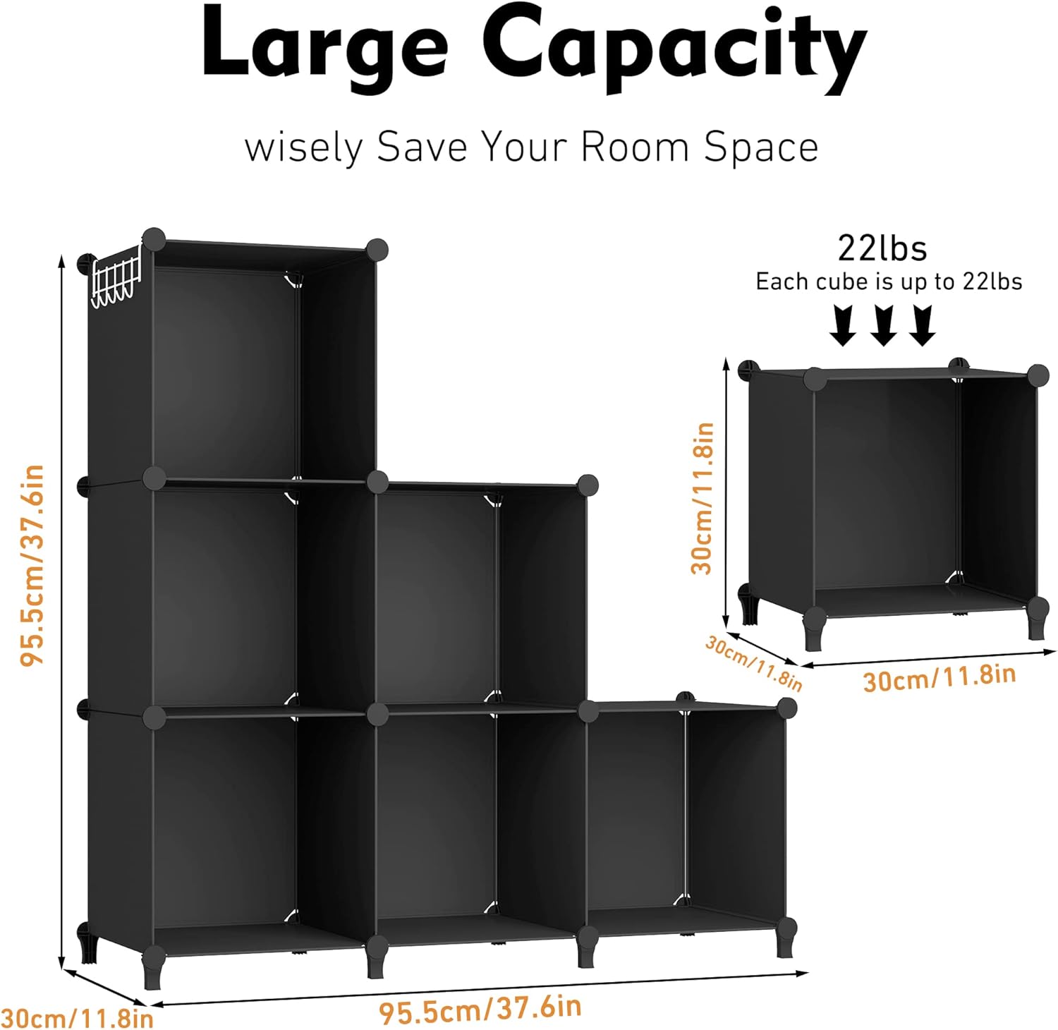 【Large Storage Space】Each cube is 12” x 12” x 12”/30 x 30 x 30cm. Consisting of polyethylene plastic sheet, sturdy metal frame and ABS resin connectors. this shelving unit can hold up to 22lbs(10kg) per cube. It’s perfect for toys, goods, books and everything you want.