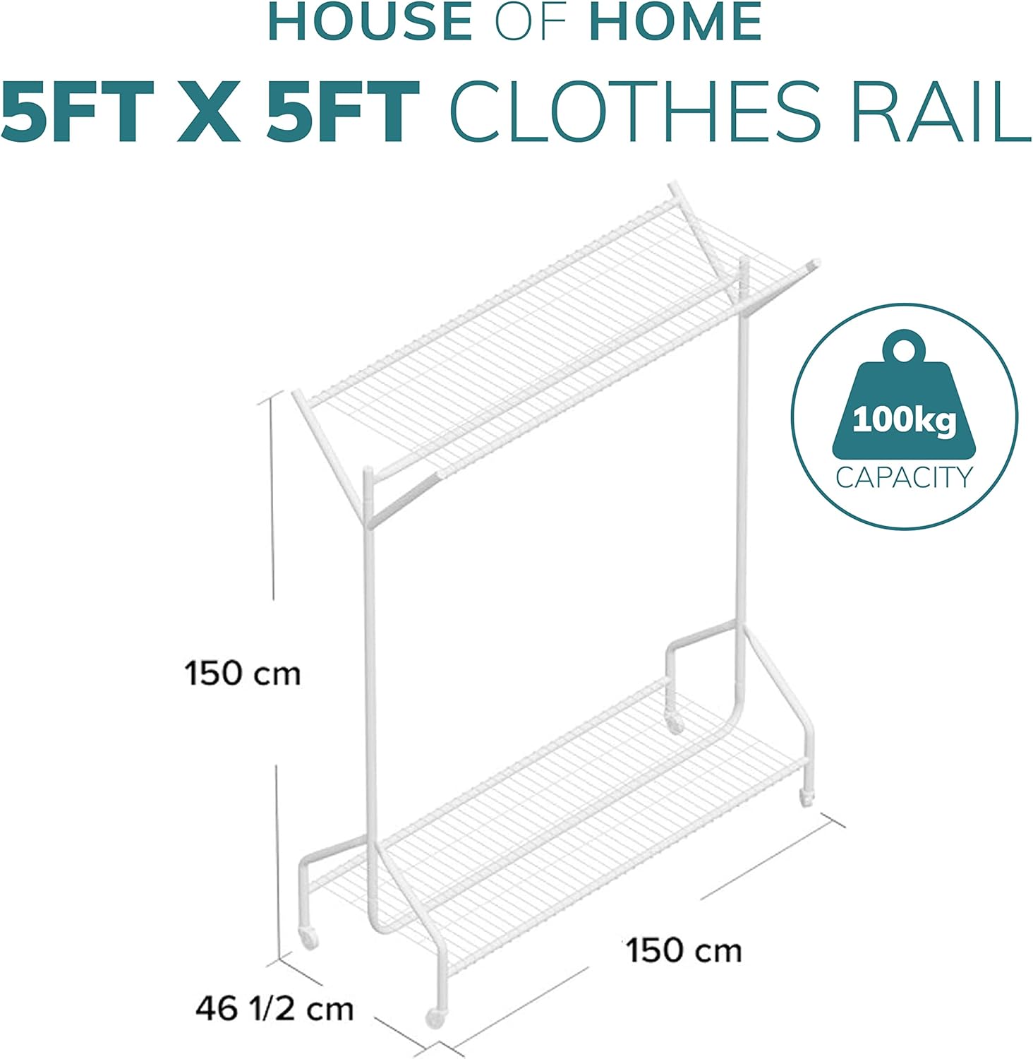 House of Home Clothes Rail Heavy Duty with Wheels Metal Wardrobe Rails For Hanging Clothing & Double Rack Shelves Storage & Organiser for Shirts, Coats, Hat & Shoes 5ft x 5ft Portable Black