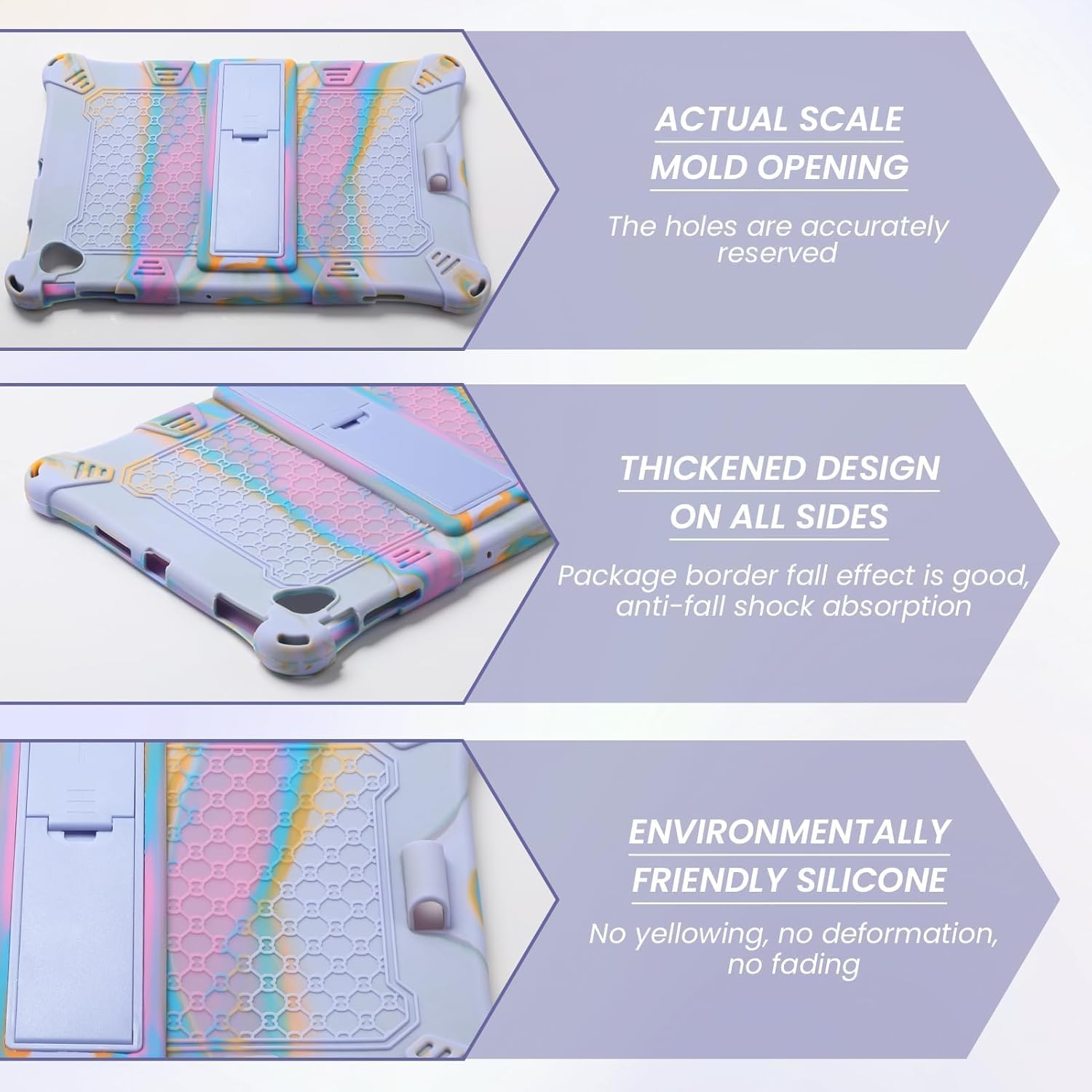 【Shockproof Shell】The ultra-thin, soft silicone used to make this tablet case feels comfy. To effectively prevent and safeguard the tablet from unintentional drops, the tablet case has strengthened corners on all four sides. The edges offer complete protection, and the thickness of the protective cover has no effect on the total lightweight. The tablet case offers good protection against shocks and scratches thanks to its distinctive thickened corner design