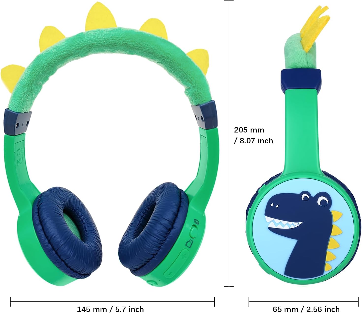 Best for Toddlers                                                                      Unique Dinosaur Design       85dB Kids-Safe Volume Limit       Bluetooth & wireless       with 3.5mm Aux cable for wired use        Comfortable & Over-ear       Rechargable & long battery life