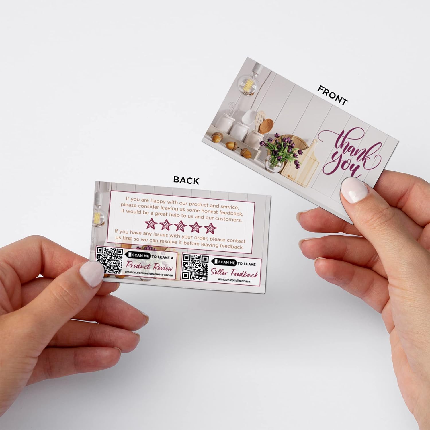 Would make a great mailer or package insert for products that are in the creative category such as DIY projects, arts & crafts, make-up, beauty supplies, or many others. Perfectly Sized For Any Type Of Package. Show your customers your appreciation by thanking them via this thank you for your purchase card. Perfect size to fit into any envelope, mailer or box. Business Card Size. Each card is 2″ high by 3.5″ wide. Vibrant color printing makes them really stand out. Even though they are printed on high quality thick card stock, they super light weight so they won’t affect your postage. QR Code Feature. By using modern QR Code technology on these cards, we make it super quick and easy for the customer to leave a rating on your listing or feedback on your seller profile. QR Code Scanning to Leave Quick Rating of ReviewBy simply scanning the QR Code with their mobile device, they will be instantly directed to the product review or seller feedback page on their Amazon app or browser. This is where they will see their most recent orders and right away will be faced with 3 options: Leave a Rating, Write a Review, Create a Video Review. Which ever option they choose, it will only benefit you and your business. This may boost the amount of ratings and reviews your products and seller profile receive. Want to Increase Ratings & Sales? Start by making it easier for your customers to leave you feedback or rate your products. Connecting with your customers and understanding their needs better is essential if you want to scale your online business. Their feedback will help you improve your products and customer service. Being proactive with fixing the issue will increase the chances of them leaving an honest product review. Products with many reviews tend to place higher in Amazon’s algorithm and will help get you in front of more customers. Which can then lead to more sales.