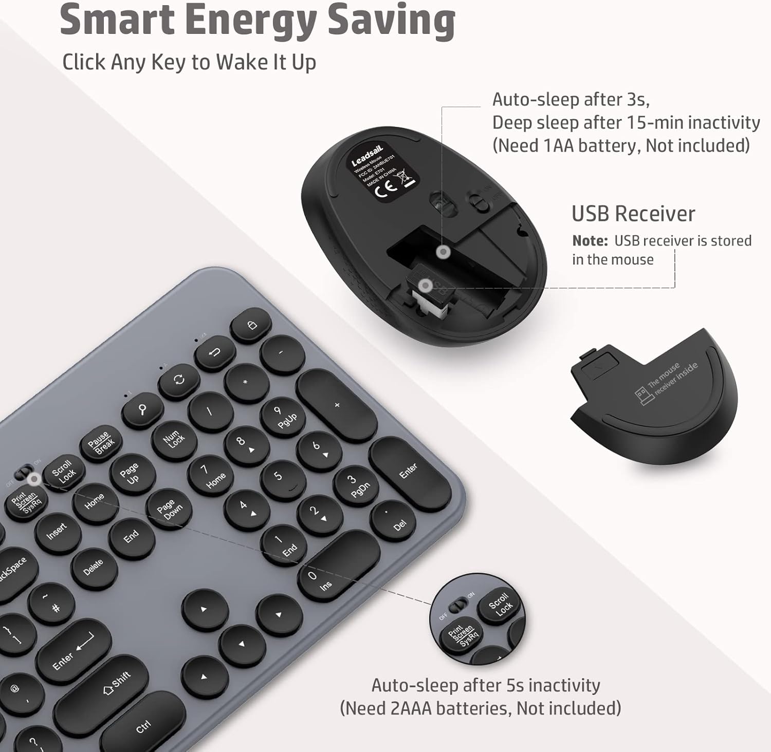 Energy Saving: The wireless keyboard and mouse set will go into sleeping mode to save battery consumption while it’s not in use for 3-5 seconds. Click or press any key or button to wake them up. (1*AA battery for the mouse and 2*AAA batteries for the keyboard, Battery not included in the package)